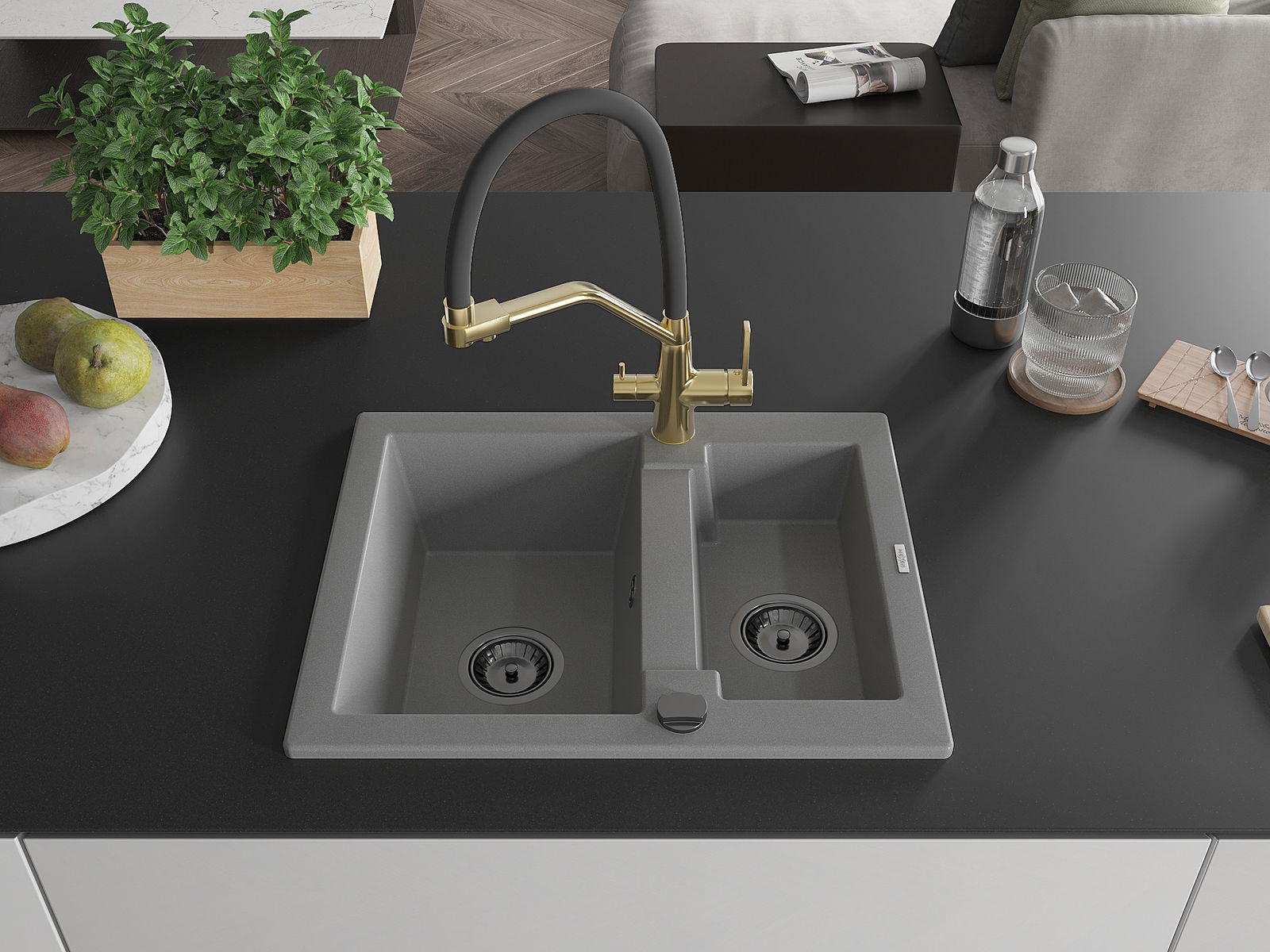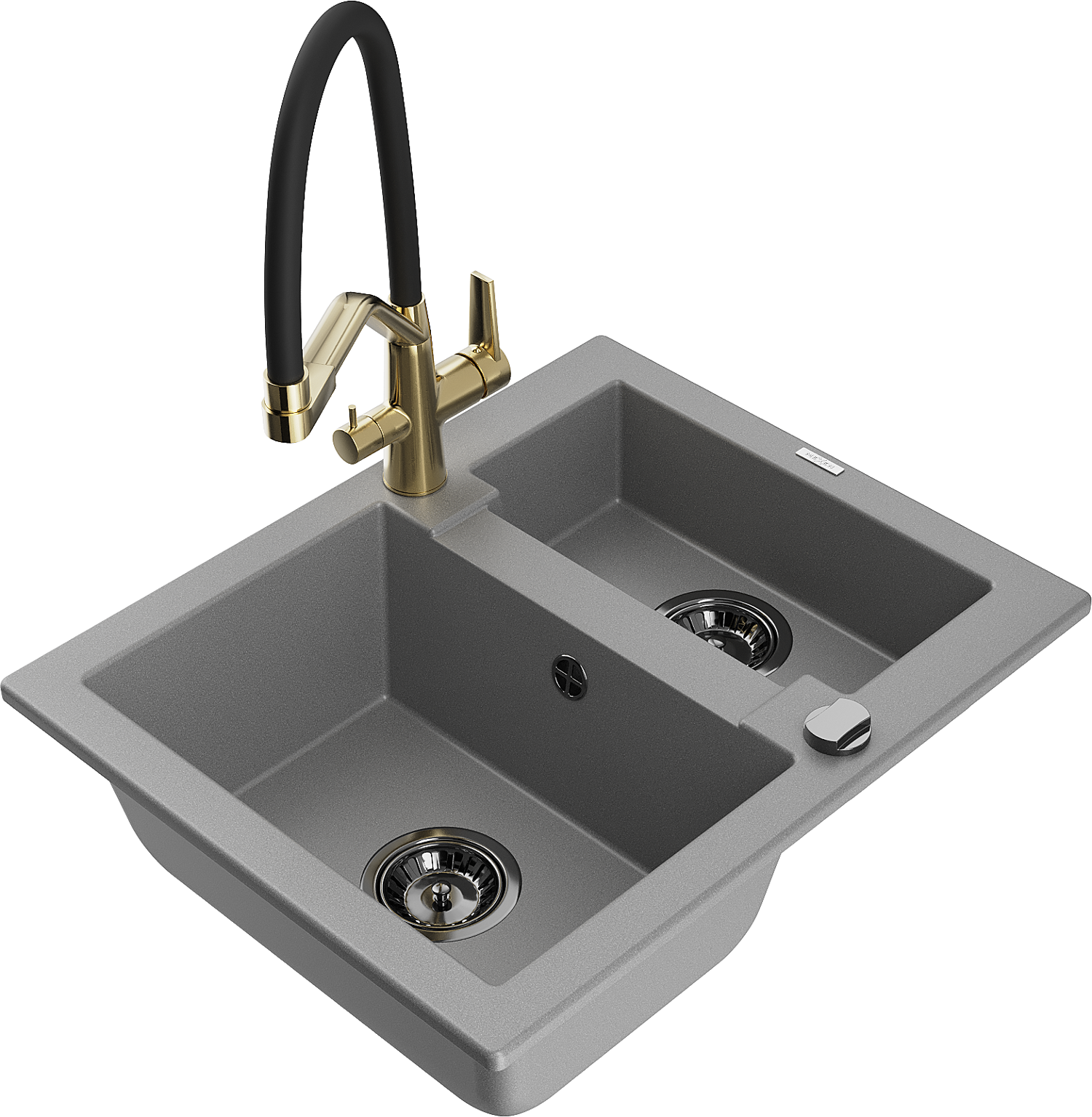 Mexen Carlos žulový dřez s 1,5 komorou a kuchyňskou baterií Duo, šedý - 6518-71-671701-57-B