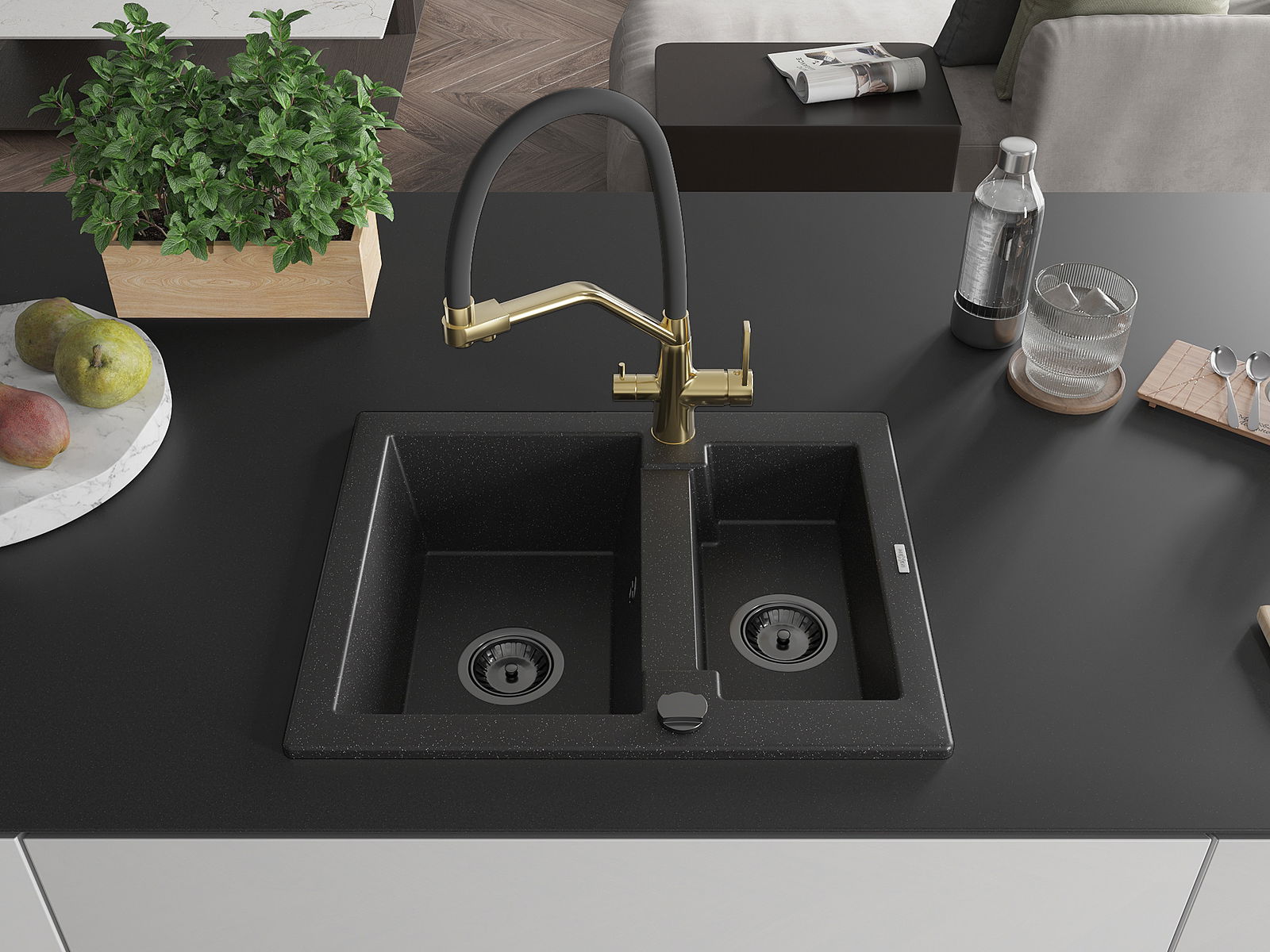 Mexen Carlos granitový dřez 1,5-komorový s kuchyňskou baterií Duo, černý/stříbrný metalik - 6518-73-671701-57-B