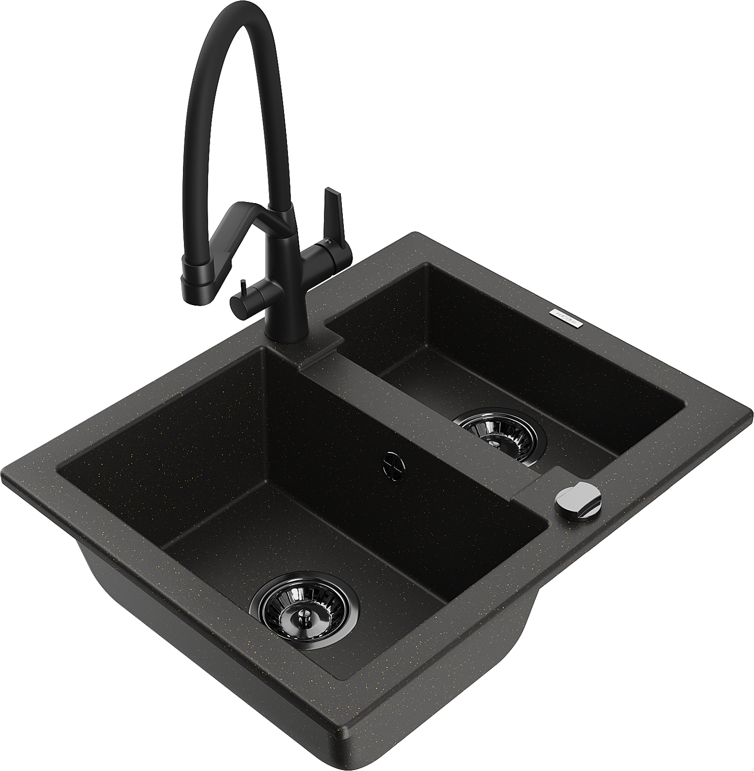 Mexen Carlos žulový dřez 1,5-komorový s kuchyňskou baterií Duo, černý/zlatý metalík - 6518-75-671701-70-B