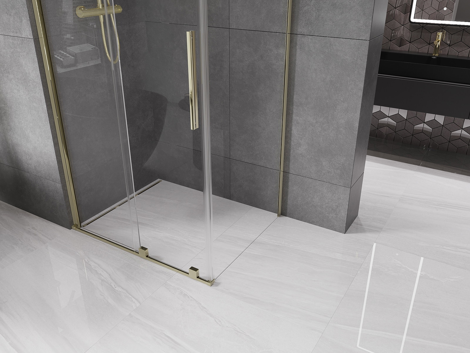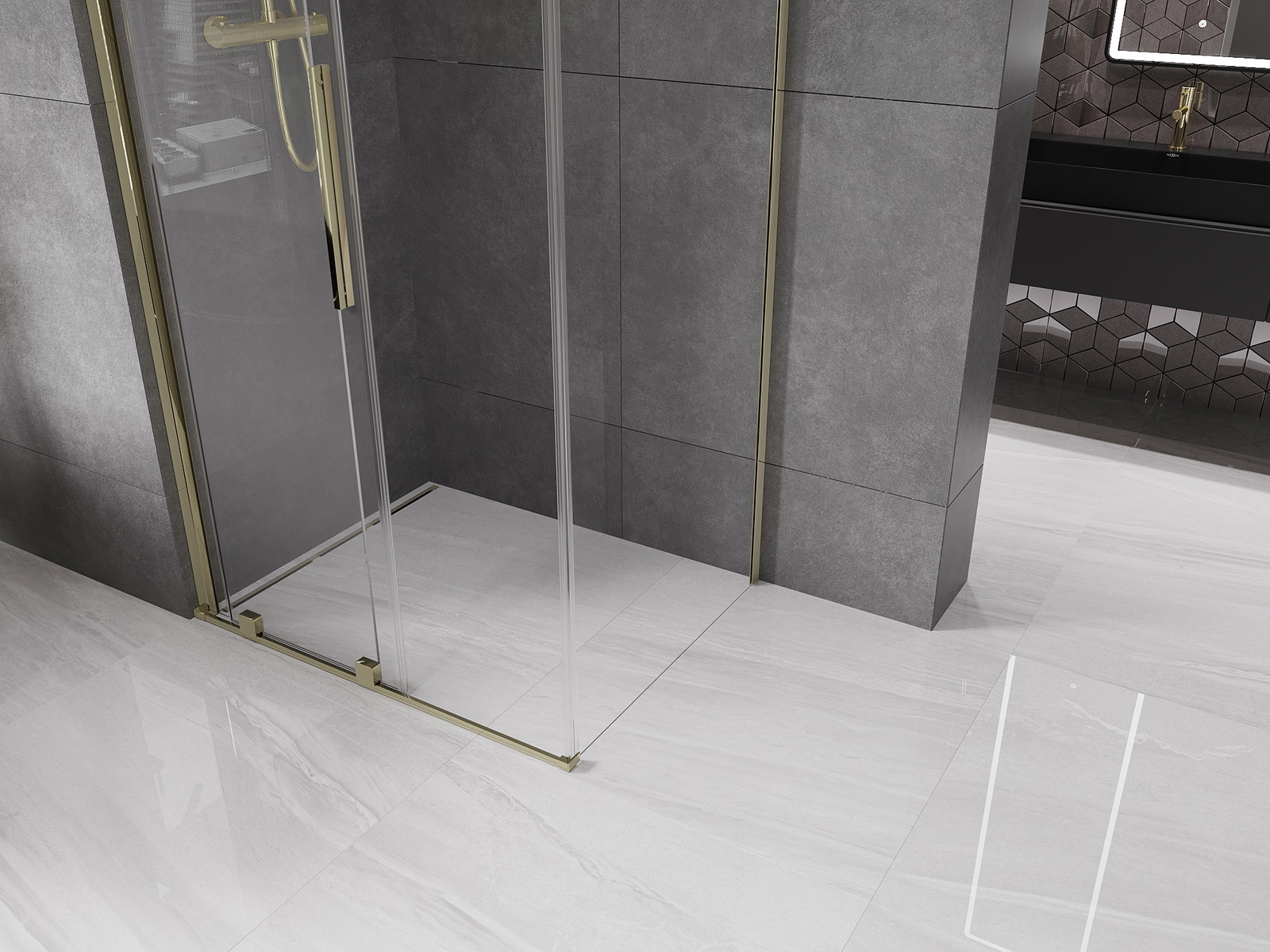 Sprchová kabina Mexen Velar vyniká elegantním zlatým povrchem a průhledným, tvrzeným sklem o tloušťce 8 mm. Univerzální montáž umožňuje instalaci na vaničku nebo dlažbu a díky šířkové regulaci a vyrovnání nerovností stěny se přesně přizpůsobí interiéru koupelny. Posuvné dveře poskytují pohodlný vstup a povrchová úprava pro snadné čištění a ocelové rukojeti zdůrazňují její funkčnost. Díky hliníkovému prahu a sadě těsnění kabina účinně odvádí vodu.