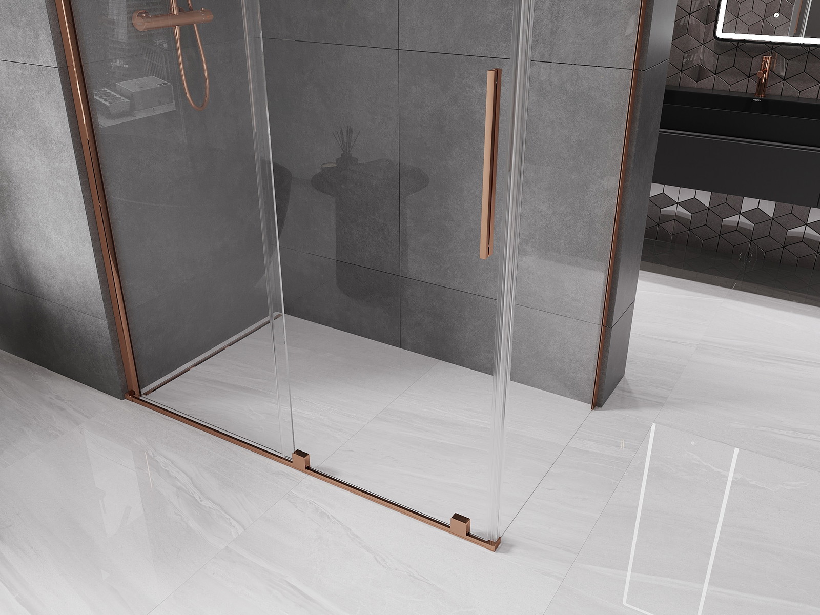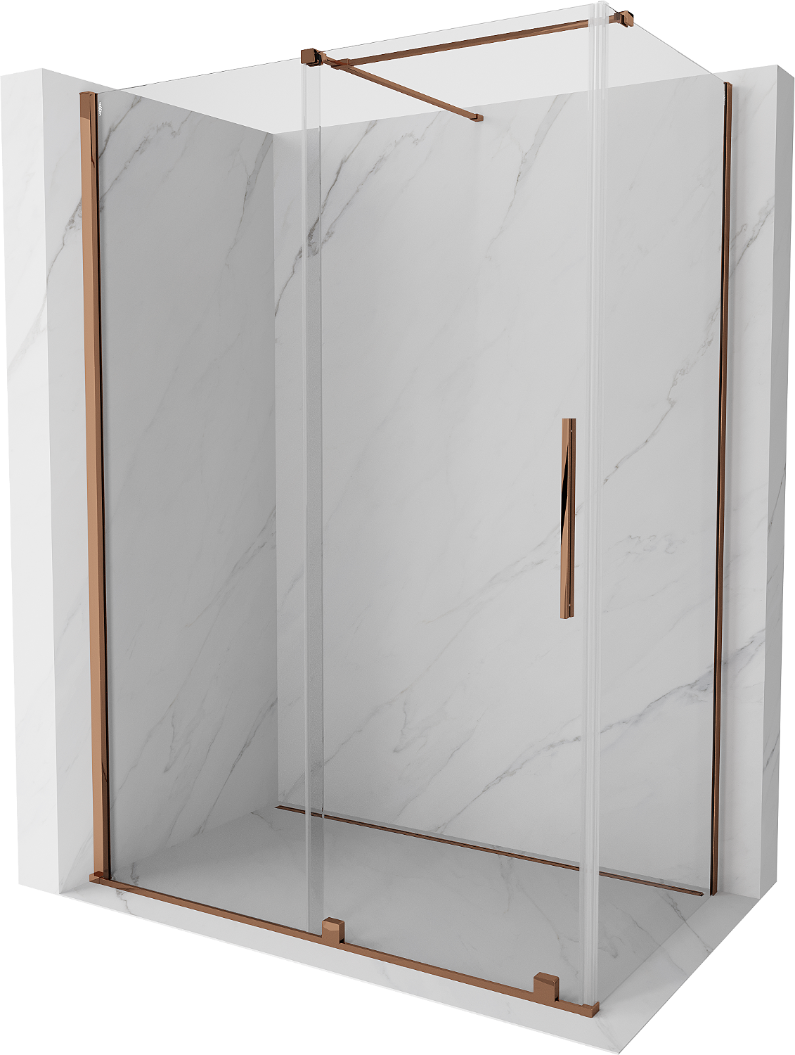 Mexen Velar je vynikající posuvná sprchová kabina o rozměrech 150x90 cm a výšce 200 cm, ideální pro moderní koupelny. Vyznačuje se univerzální montáží, průhledným tvrzeným sklem o tloušťce 8 mm a luxusní povrchovou úpravou v barvě růžového zlata. Má hliníkové profily, vrstvu usnadňující čištění, možnost vyrovnání nerovností stěny a regulaci šířky. Lze ji montovat na vaničku nebo dlaždice. Pevné jednotlivé válečky a nerezová rukojeť zajišťují trvanlivost a eleganci.