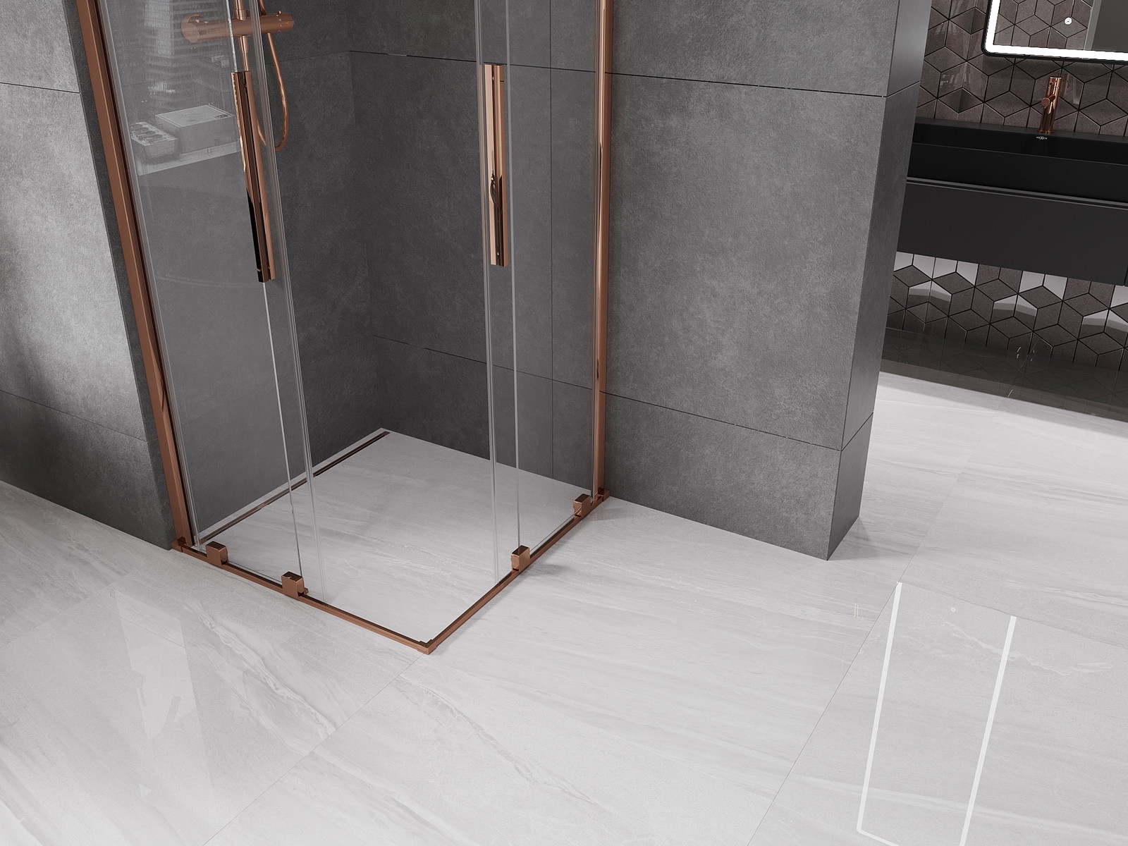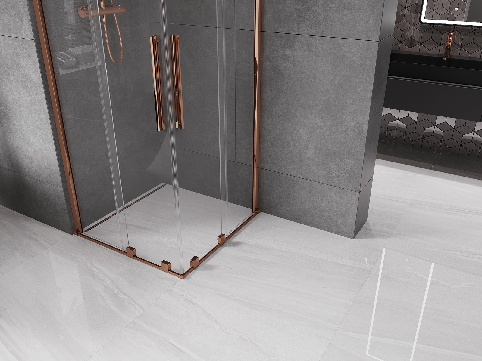 Sprchová kabina Mexen Velar Duo je výjimečnou kombinací stylu a funkcionality. Produkt o rozměrech 80x80 cm a výšce 200 cm se vyznačuje univerzální montáží a posuvnými dveřmi. Transparentní tvrzené sklo o tloušťce 8 mm s vrstvou usnadňující čištění zajišťuje elegantní vzhled, zatímco povrchová úprava v odstínu růžového zlata dodává luxus. Hliníkový profil s možností regulace šířky a vyrovnání nerovností zdi zaručuje ideální přizpůsobení. Těsnost kabiny podporují vysoce kvalitní komponenty, jako jsou ocelové madlo a sada těsnění.