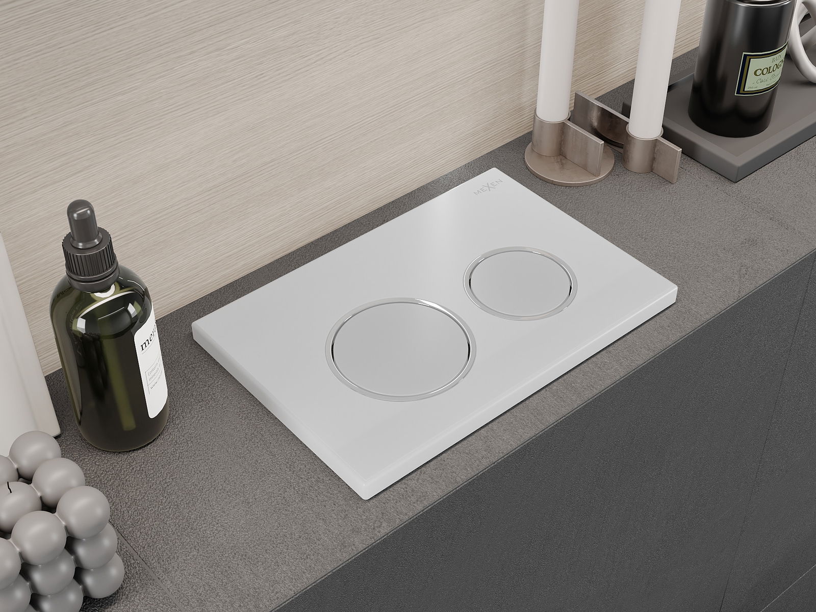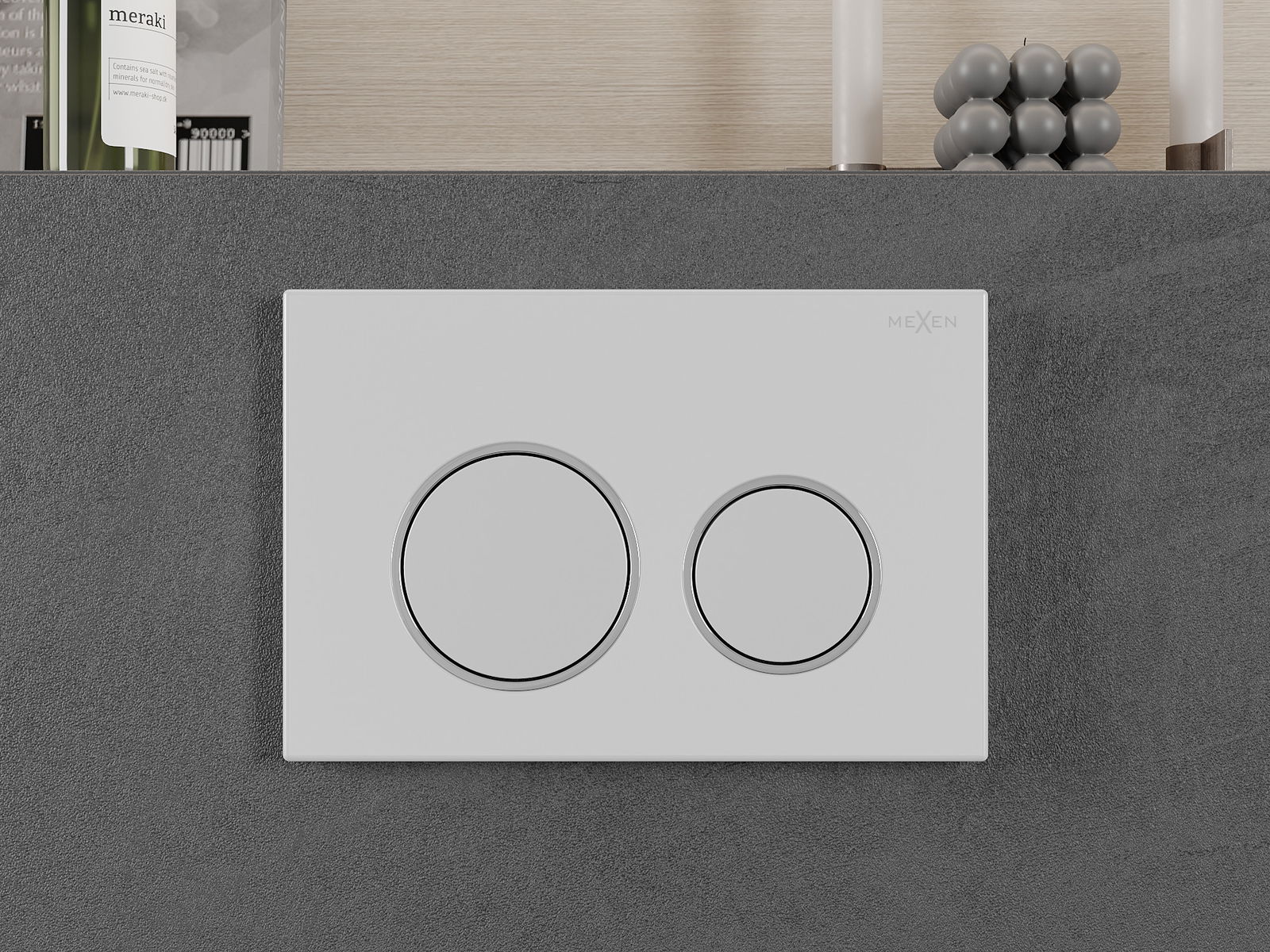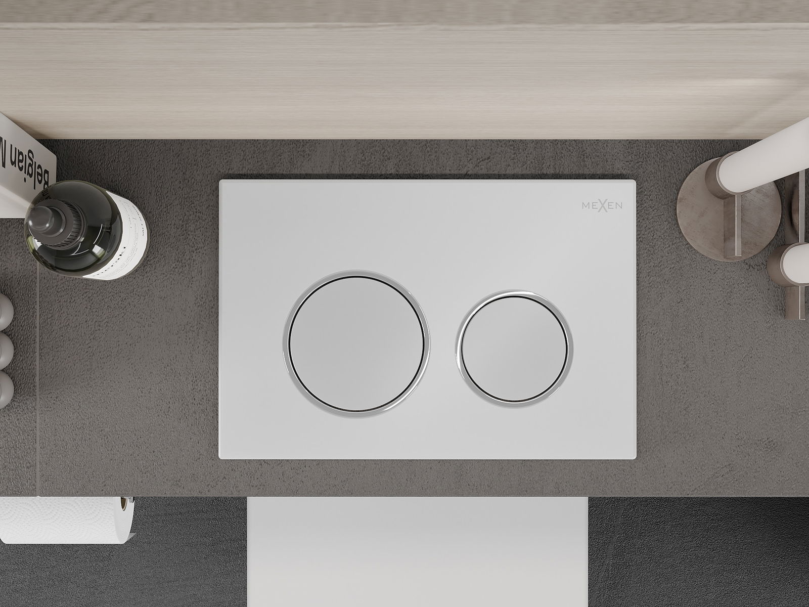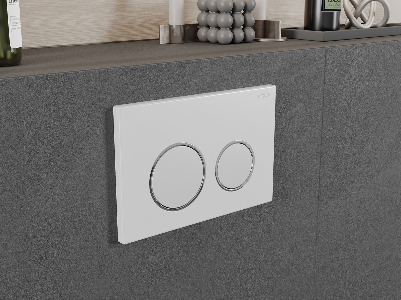 Tlačítko je určeno pro rámy Mexen ze série XS. Může být montováno jak zepředu, tak i shora rámu, což zvyšuje jeho univerzálnost. Takové řešení usnadňuje instalaci v různých montážních podmínkách. Díky tomu je obsluha splachování pohodlná a intuitivní.