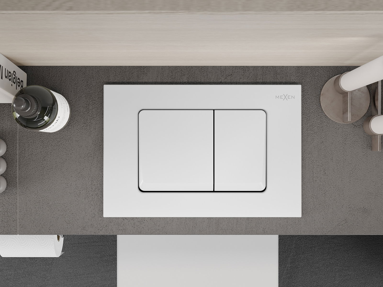 Tlačítko je určeno pro rámy Mexen ze série XS. Může být montováno jak zepředu, tak i shora rámu, což zvyšuje jeho univerzálnost. Takové řešení usnadňuje instalaci v různých montážních podmínkách. Díky tomu je obsluha splachování pohodlná a intuitivní.