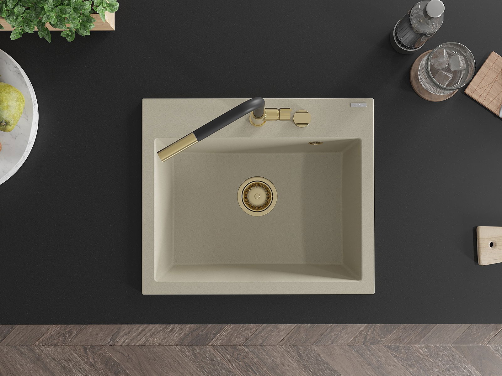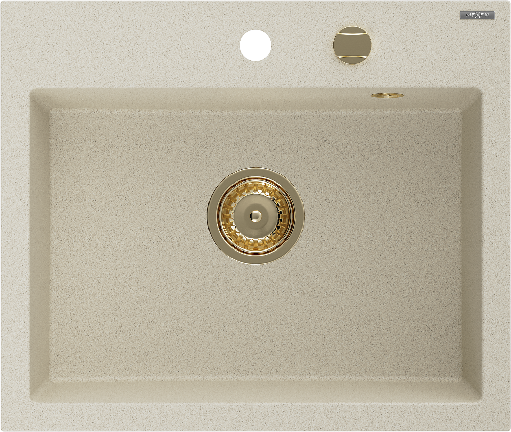 Mexen Oscar granitový dřez 1-komorový 580 x 490 mm, béžový, sifon zlatý - 6519581000-69-G