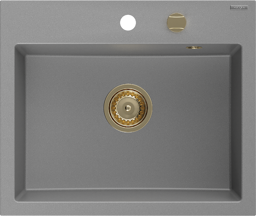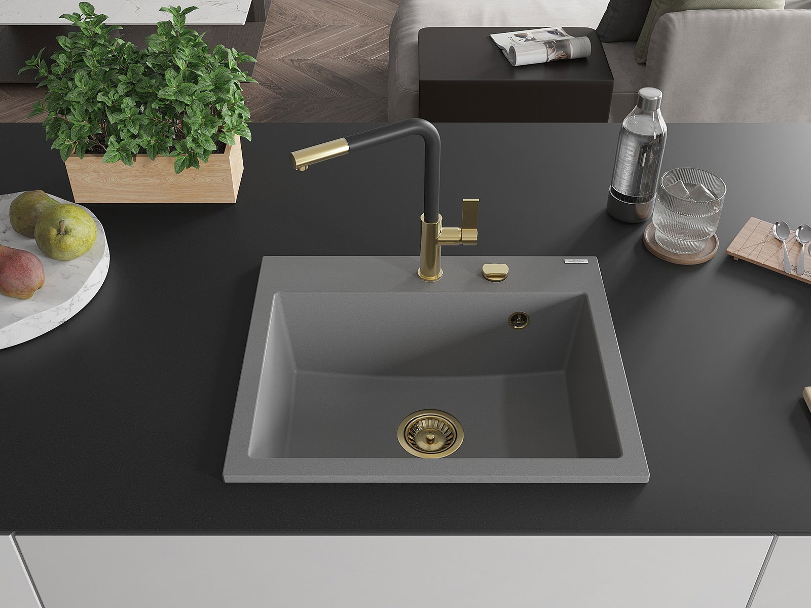 Mexen Oscar granitový dřez s 1 komorou 580 x 490 mm, šedý, sifon zlatý - 6519581000-71-G