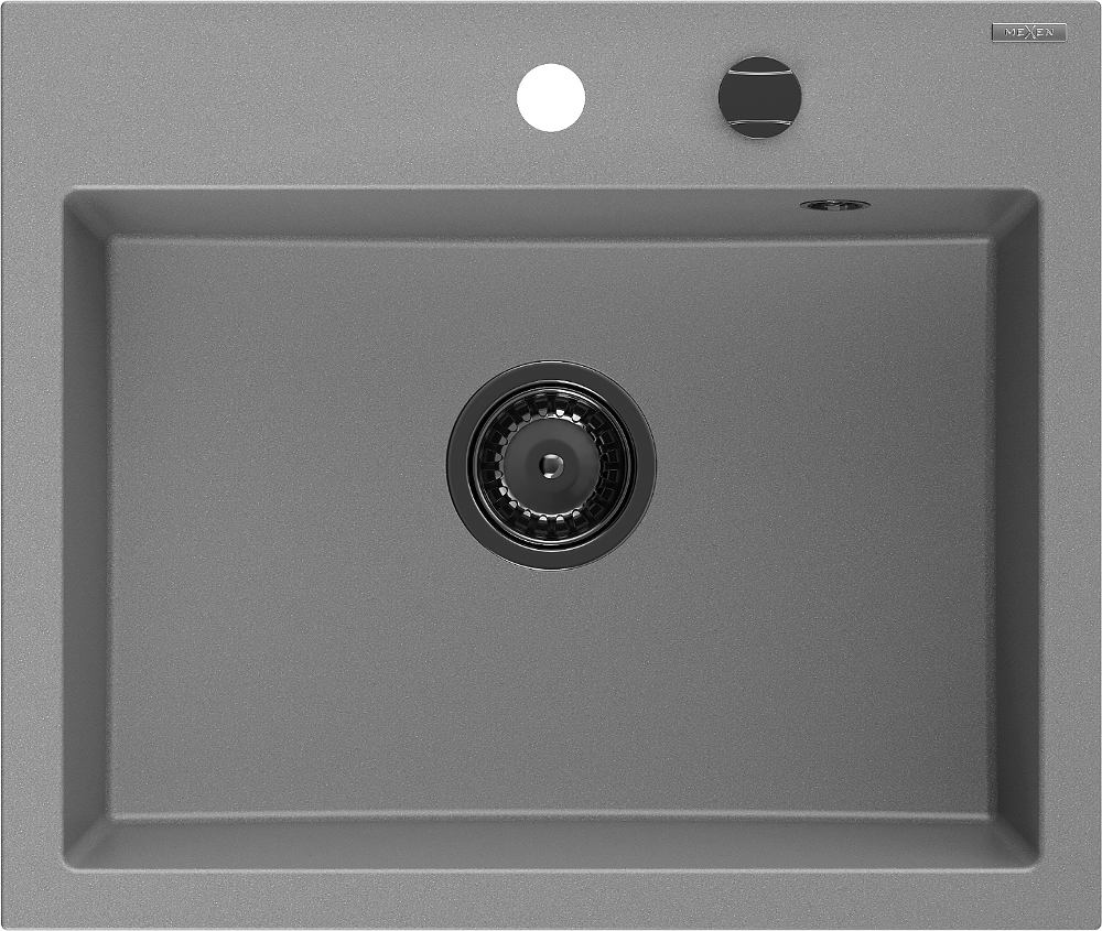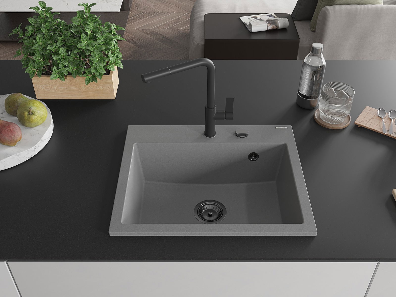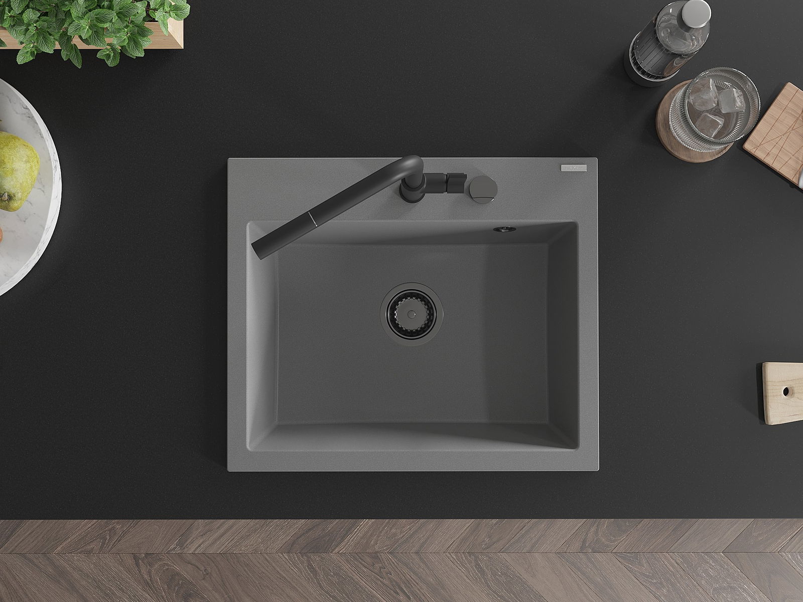Mexen Oscar žulový dřez s jednou komorou 580 x 490 mm, šedý, sifon černý - 6519581000-71-B
