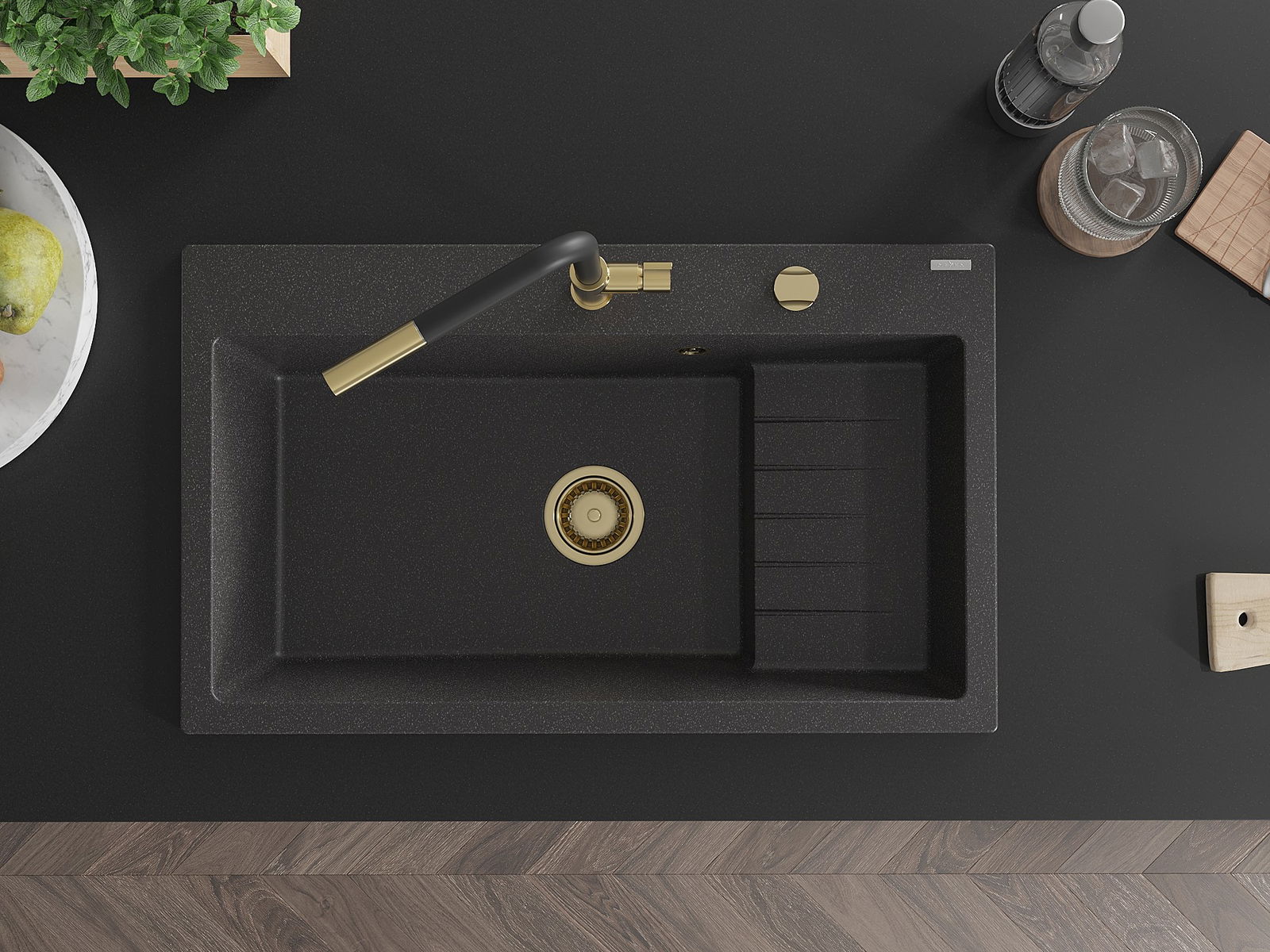 Mexen Omar dřez granitový 1-komorový 800 x 480 mm, černý tečkovaný, sifon zlatý - 6520801005-76-G