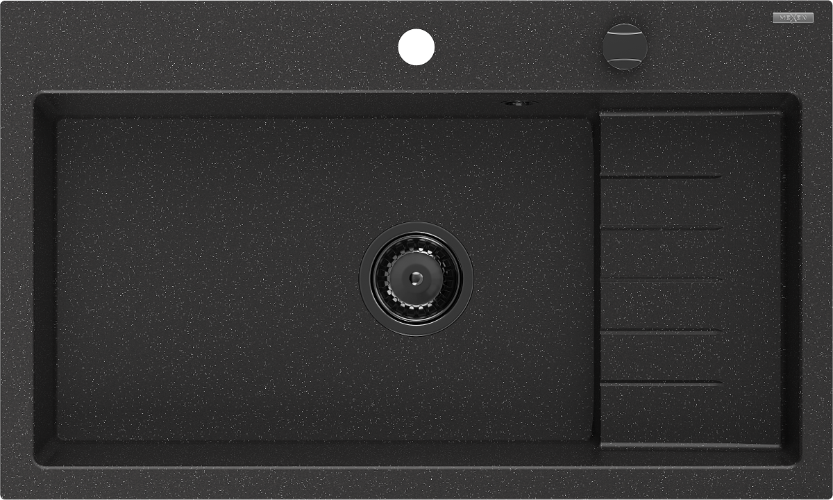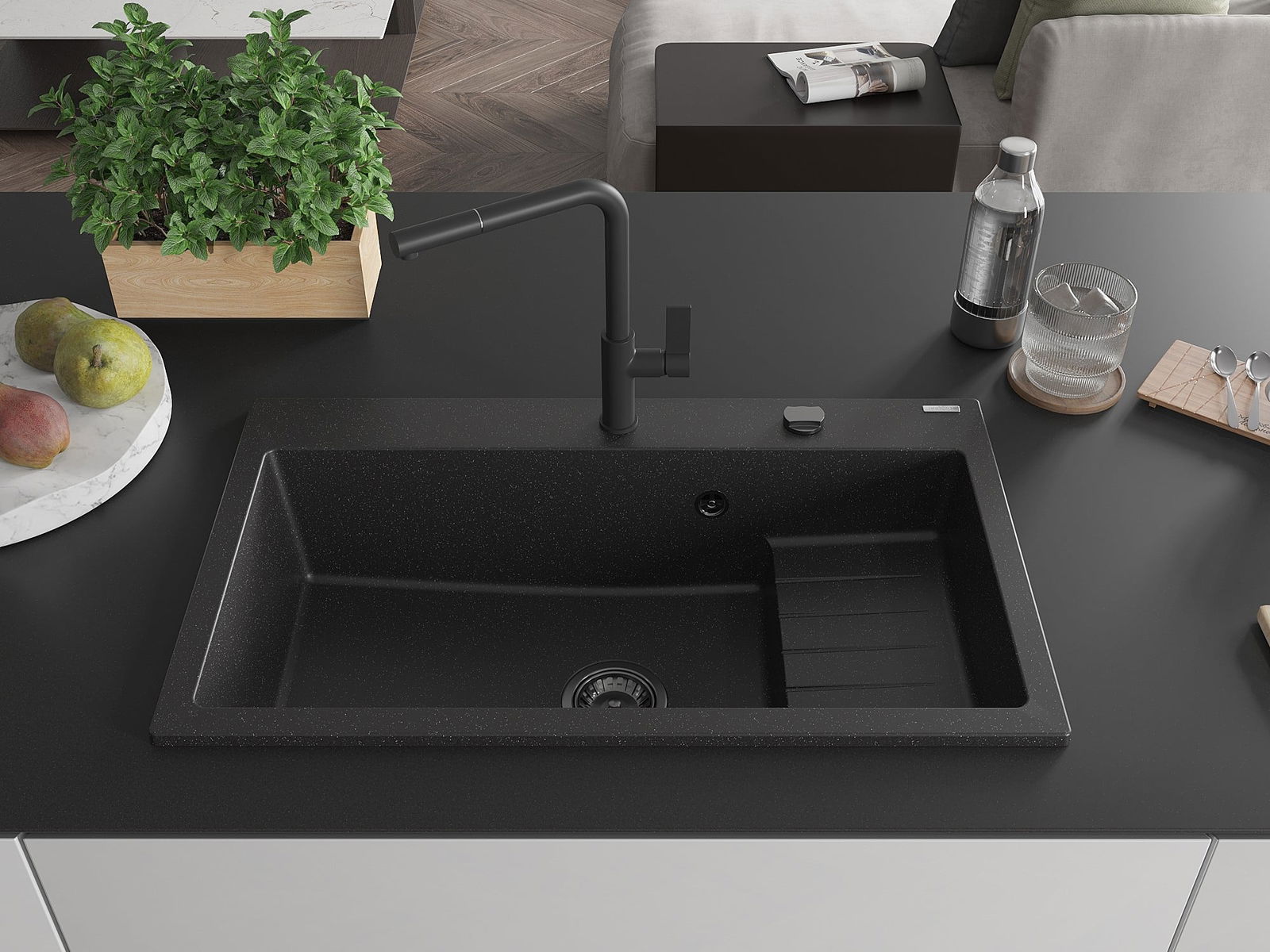 Mexen Omar žulový dřez 1-komorový 800 x 480 mm, černý/stříbrný metalický, černý sifon - 6520801005-73-B