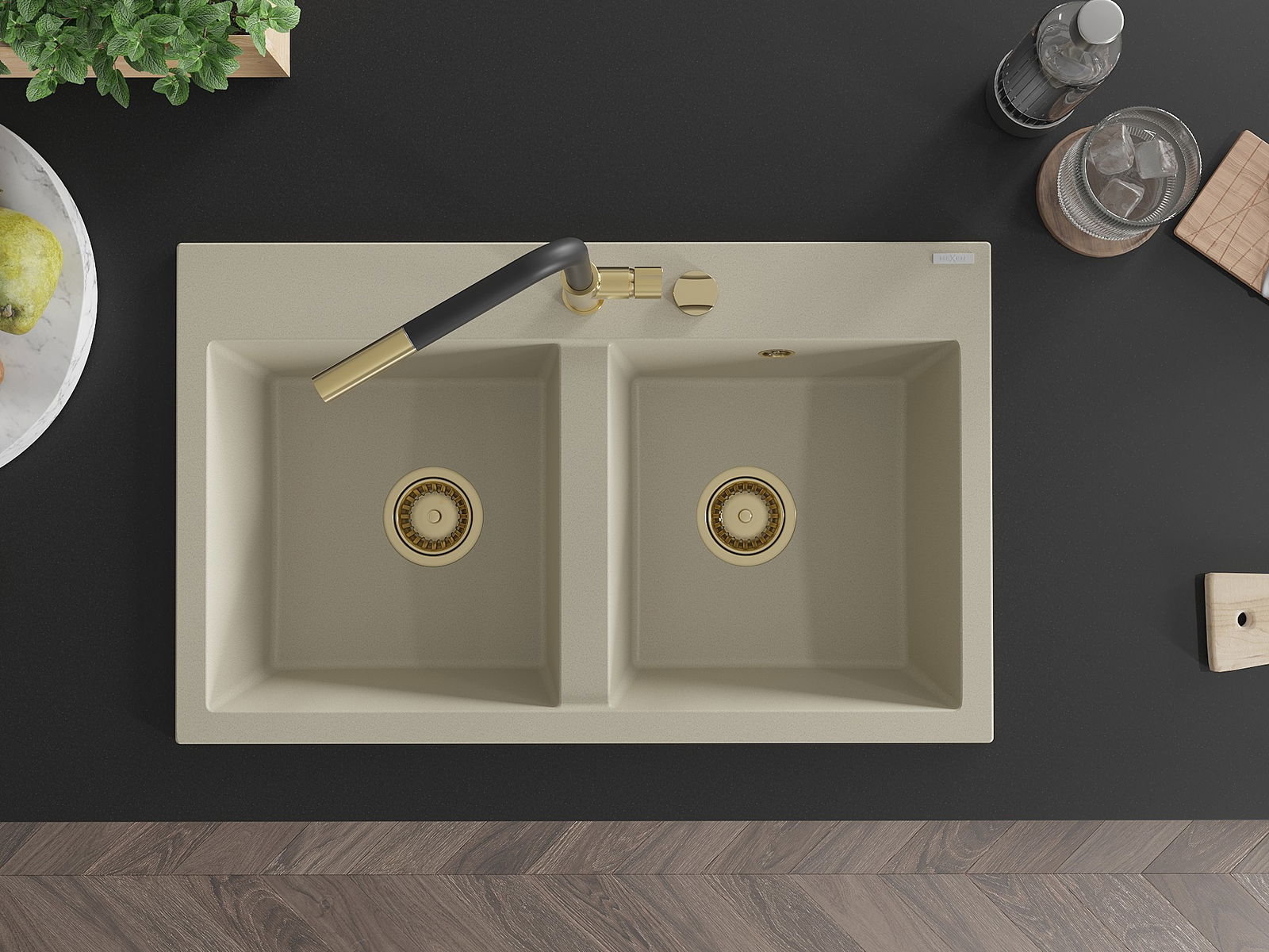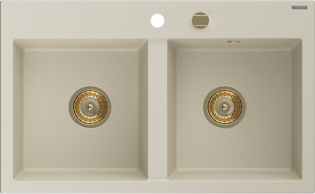 Mexen Hektor žulový dřez 2-komorový 800 x 480 mm, béžový, sifon zlatý - 6521802000-69-G