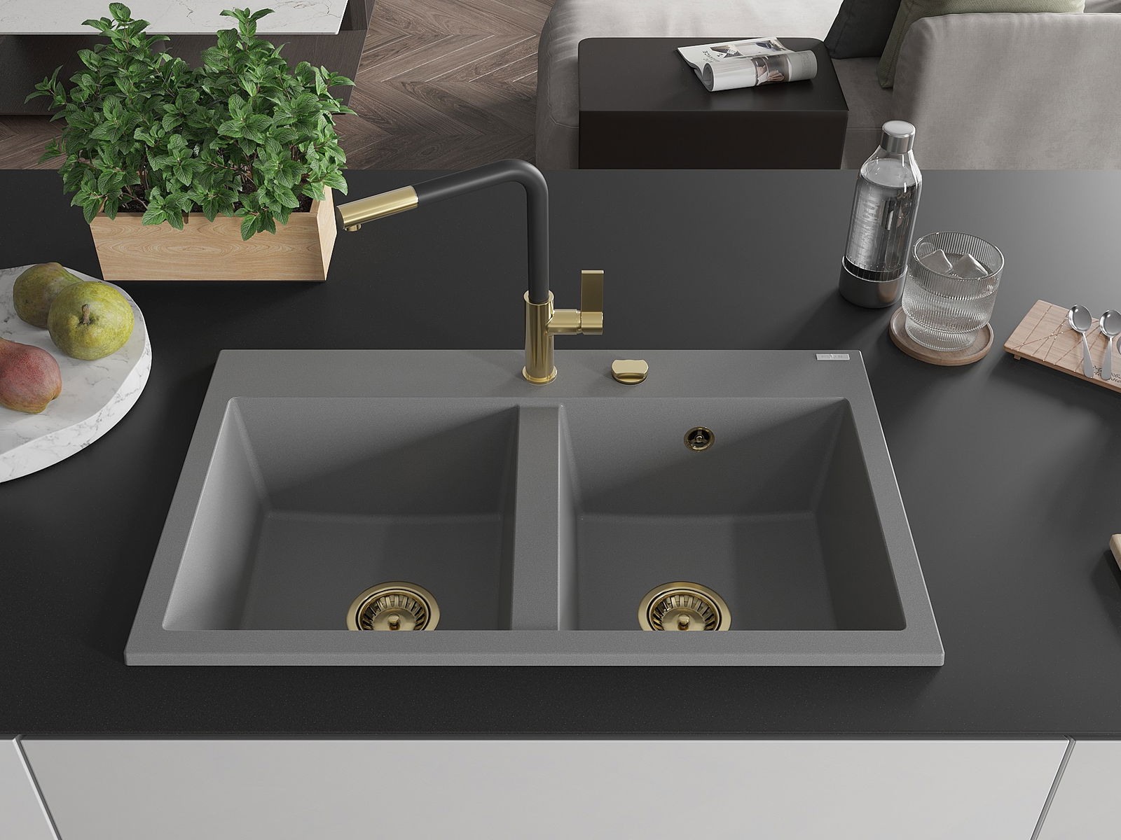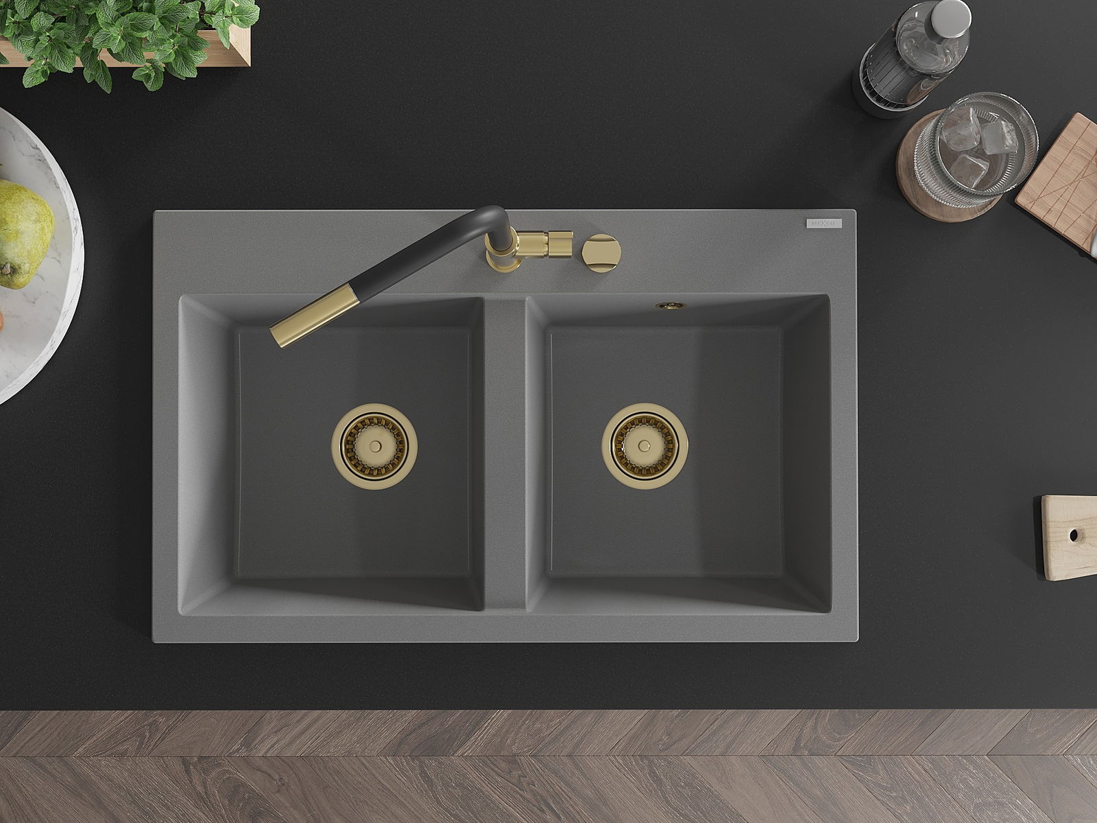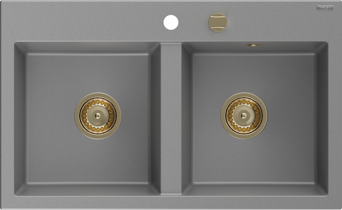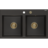 Mexen Hektor dvoukomorový granitový dřez 800 x 480 mm, šedý, zlatý sifon - 6521802000-71-G