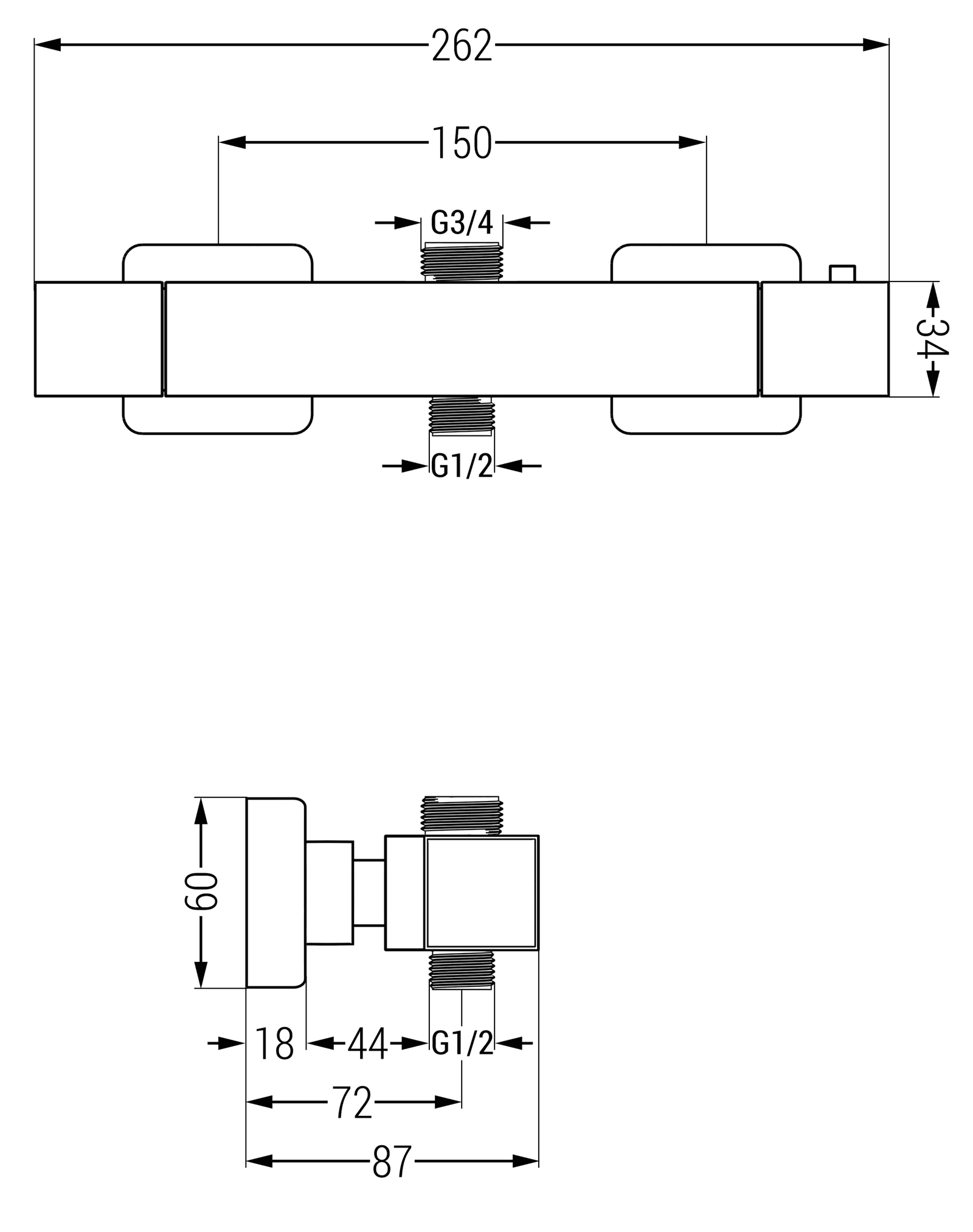 Přípojení sprchy: G 3/4" (horní) a G 1/2" (dolní)