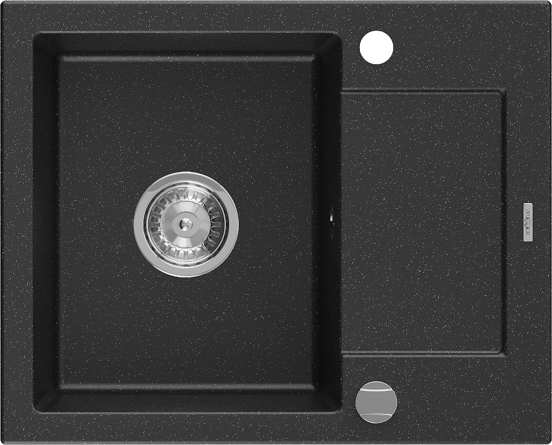 Mexen Enzo granitový dřez s odkapávačem, 1-komorový, 576 x 465 mm, černý/stříbrný metalik, sifon chrom - 6506571005-73