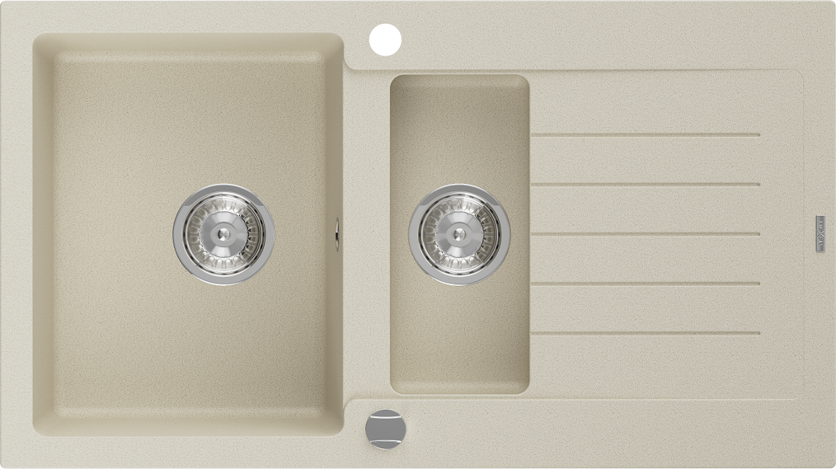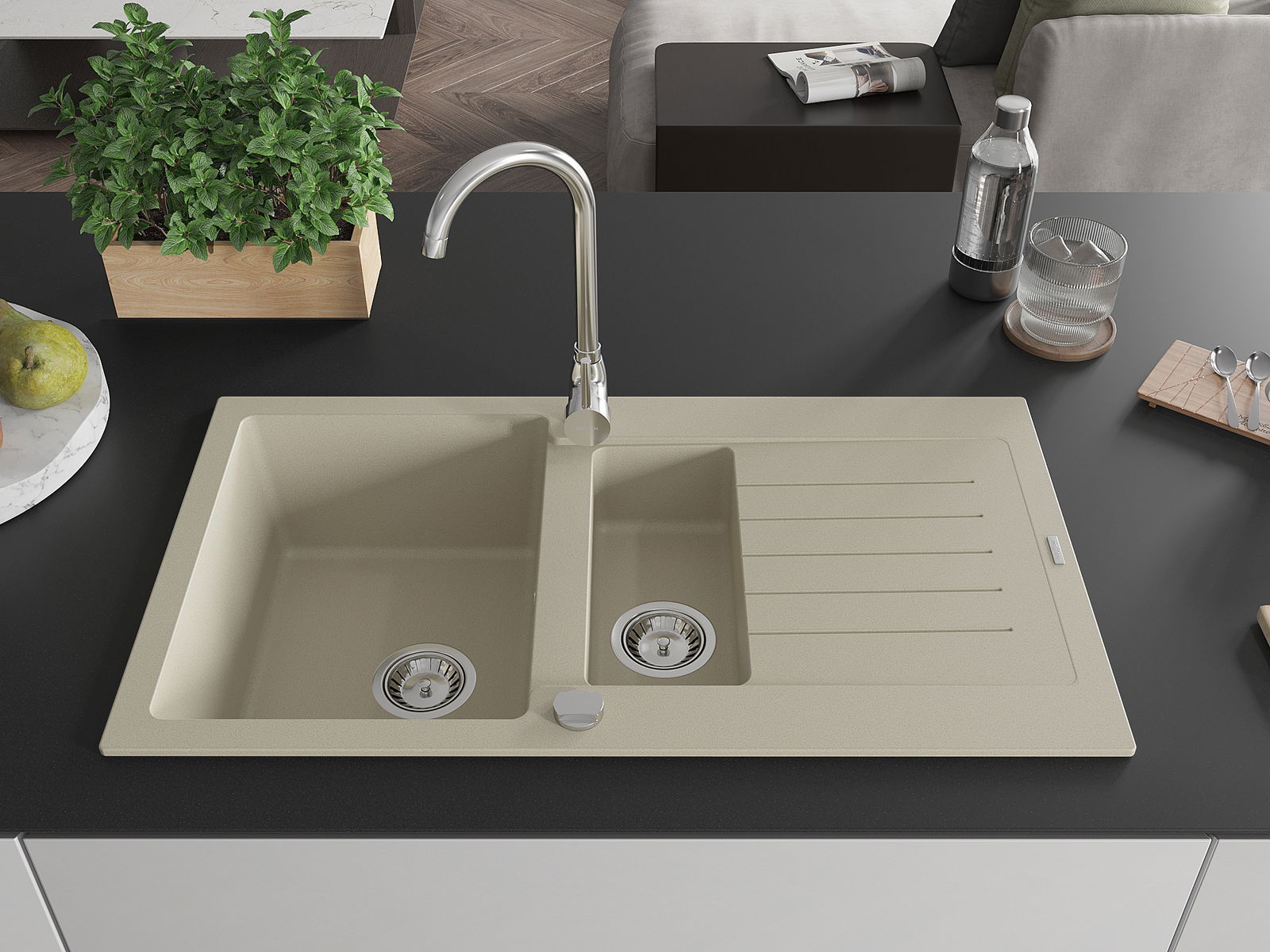 Mexen Matias granitový dřez 1,5-komorový s odkapávačem 900 x 505 mm, béžový, sifon chrom - 6502901505-69