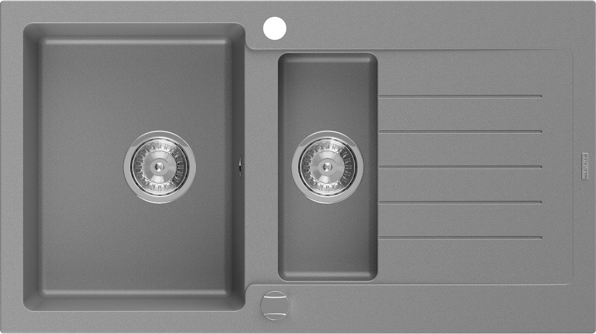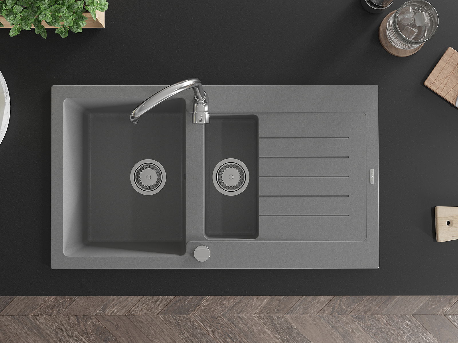 Mexen Matias dřez z umělého kamene 1,5-komorový s odkapávačem 900 x 505 mm, šedý, sifon chrom - 6502901505-71