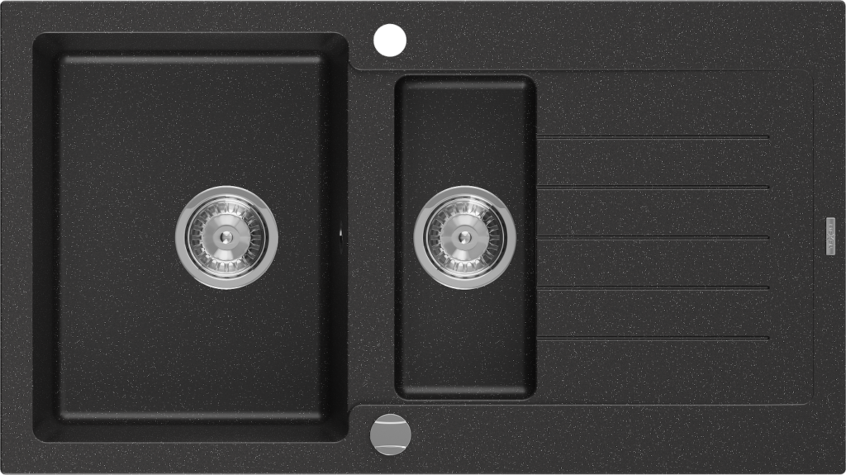 Mexen Matias žulový dřez 1,5komorový s odkapávačem 900 x 505 mm, černý/stříbrný metalický, sifon chrom - 6502901505-73