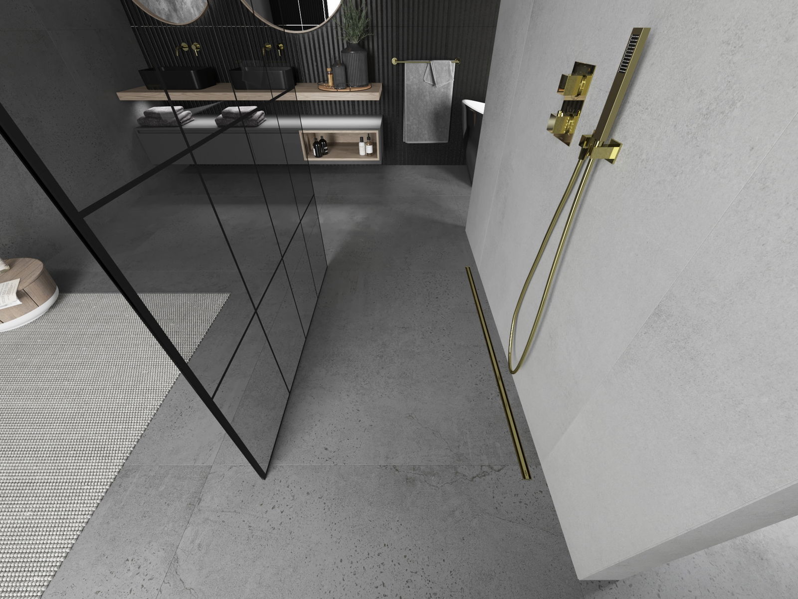 Mexen Kioto volně stojící sprchová stěna 160 x 200 cm, černá mřížka 8 mm, zlatá - 800-160-002-50-77