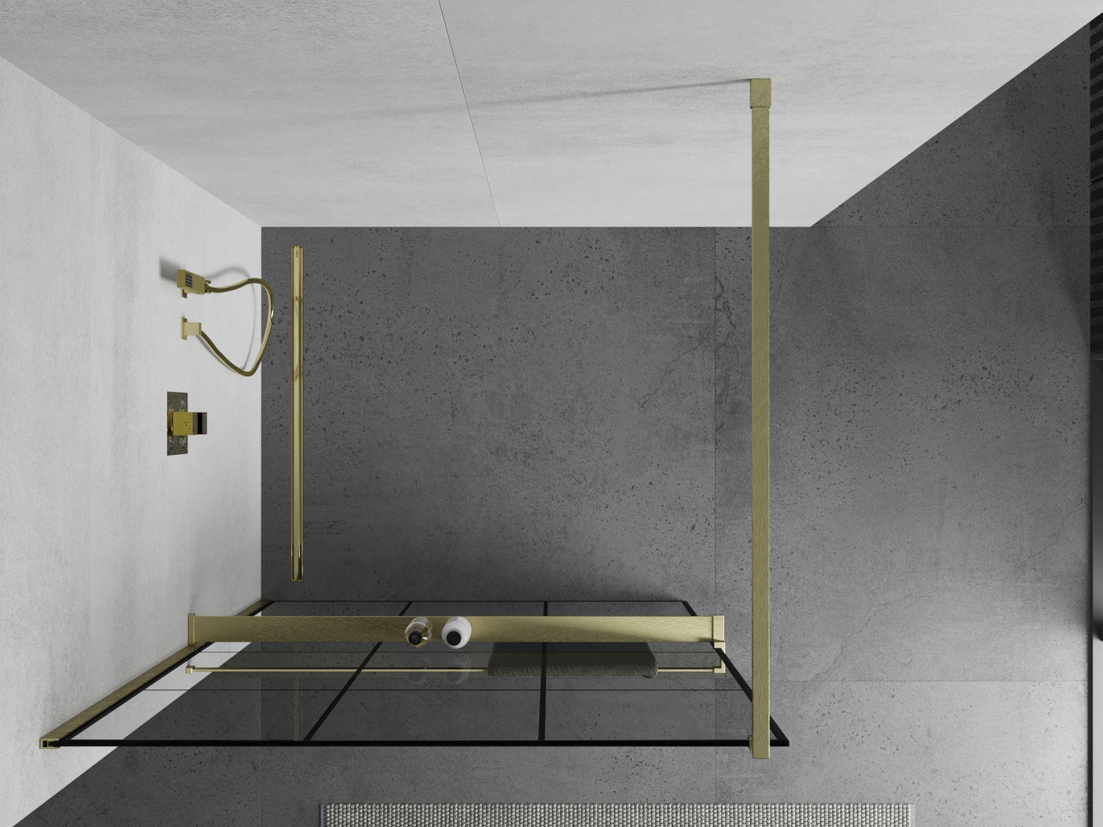Mexen Kioto+ sprchová stěna s policí Walk-in 100 x 200 cm, černá mřížka, zlatá kartáčovaná - 800-100-121-55-77