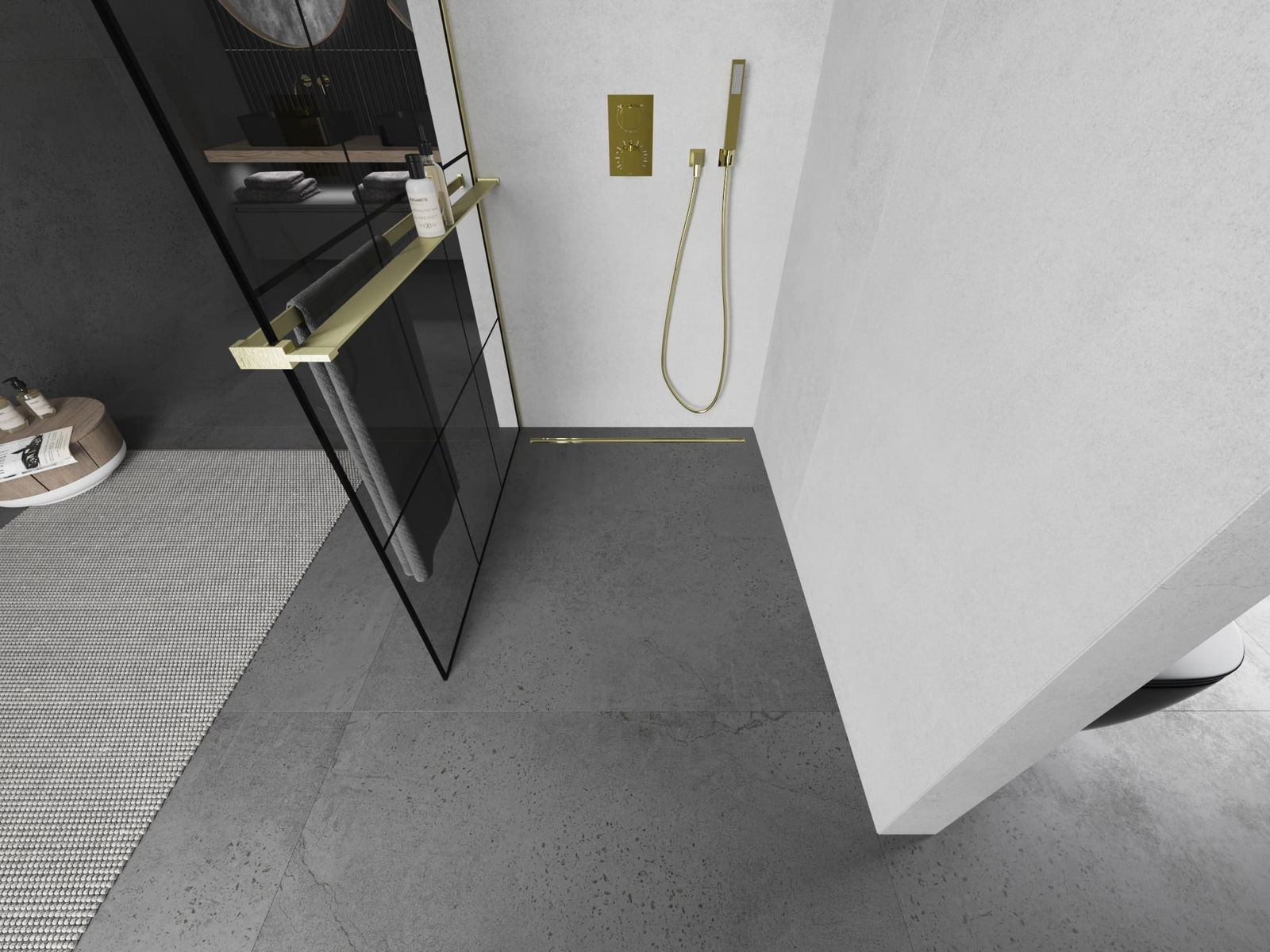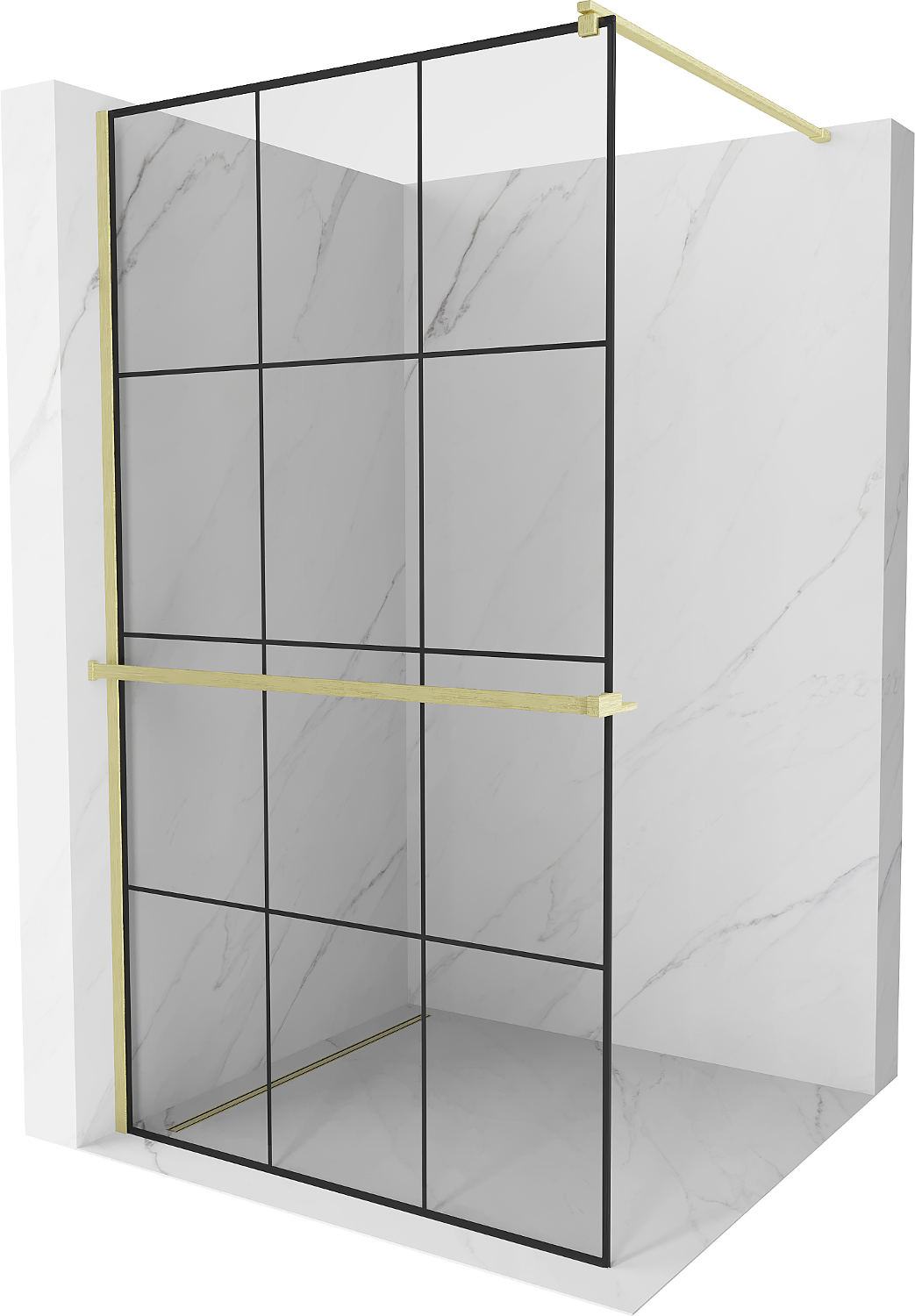 Mexen Kioto+ sprchová stěna s policí Walk-in 110 x 200 cm, černá mřížka, zlatá kartáčovaná - 800-110-121-55-77