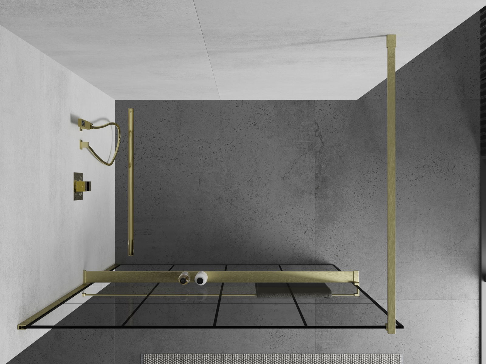 Mexen Kioto+ sprchová stěna s policí Walk-in 130 x 200 cm, černá mřížka, zlatá kartáčovaná - 800-130-121-55-77
