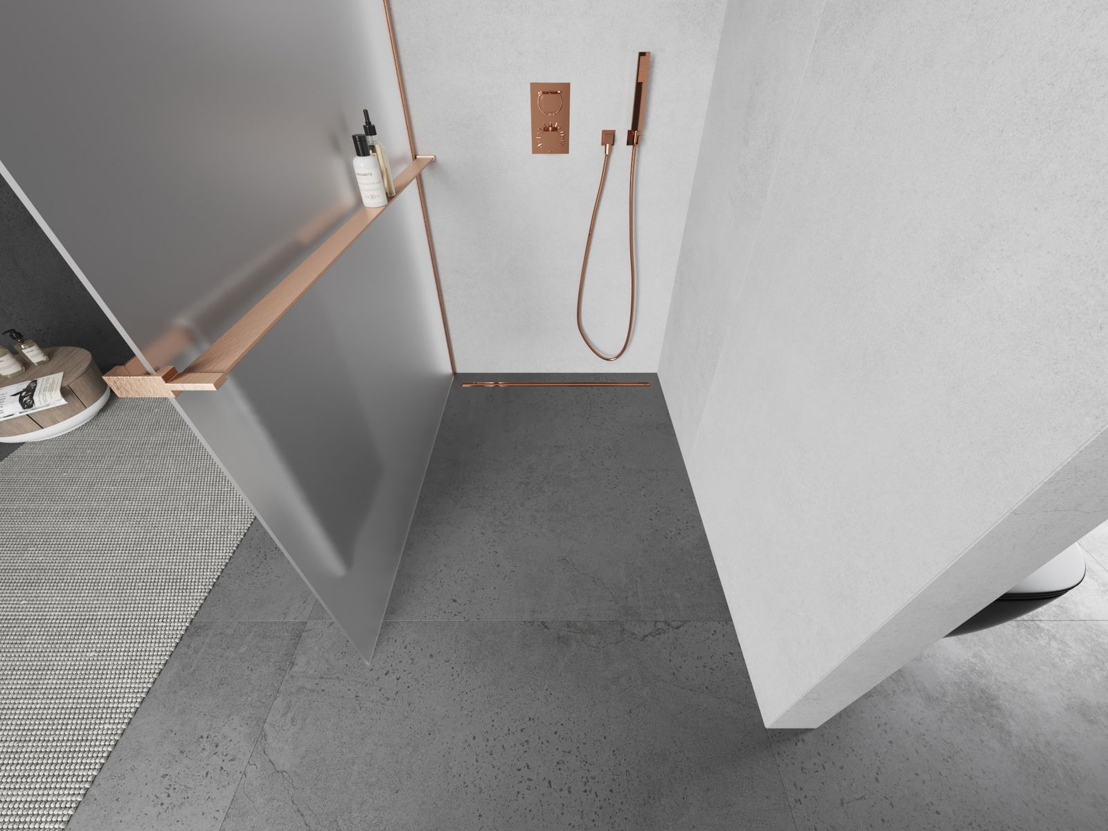 Mexen Kioto+ sprchová zástěna s policí Walk-in 90 x 200 cm, matné sklo, kartáčovaná měď - 800-090-121-65-30