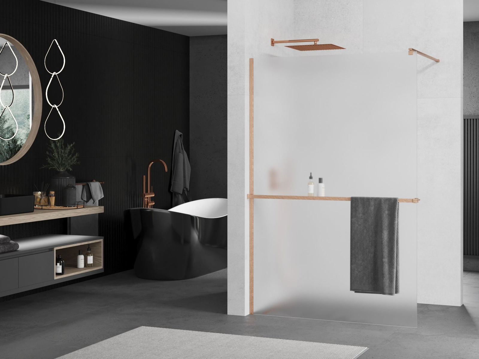 Mexen Kioto+ sprchová stěna s policí Walk-in 110 x 200 cm, námraza, kartáčovaná měď - 800-110-121-65-30