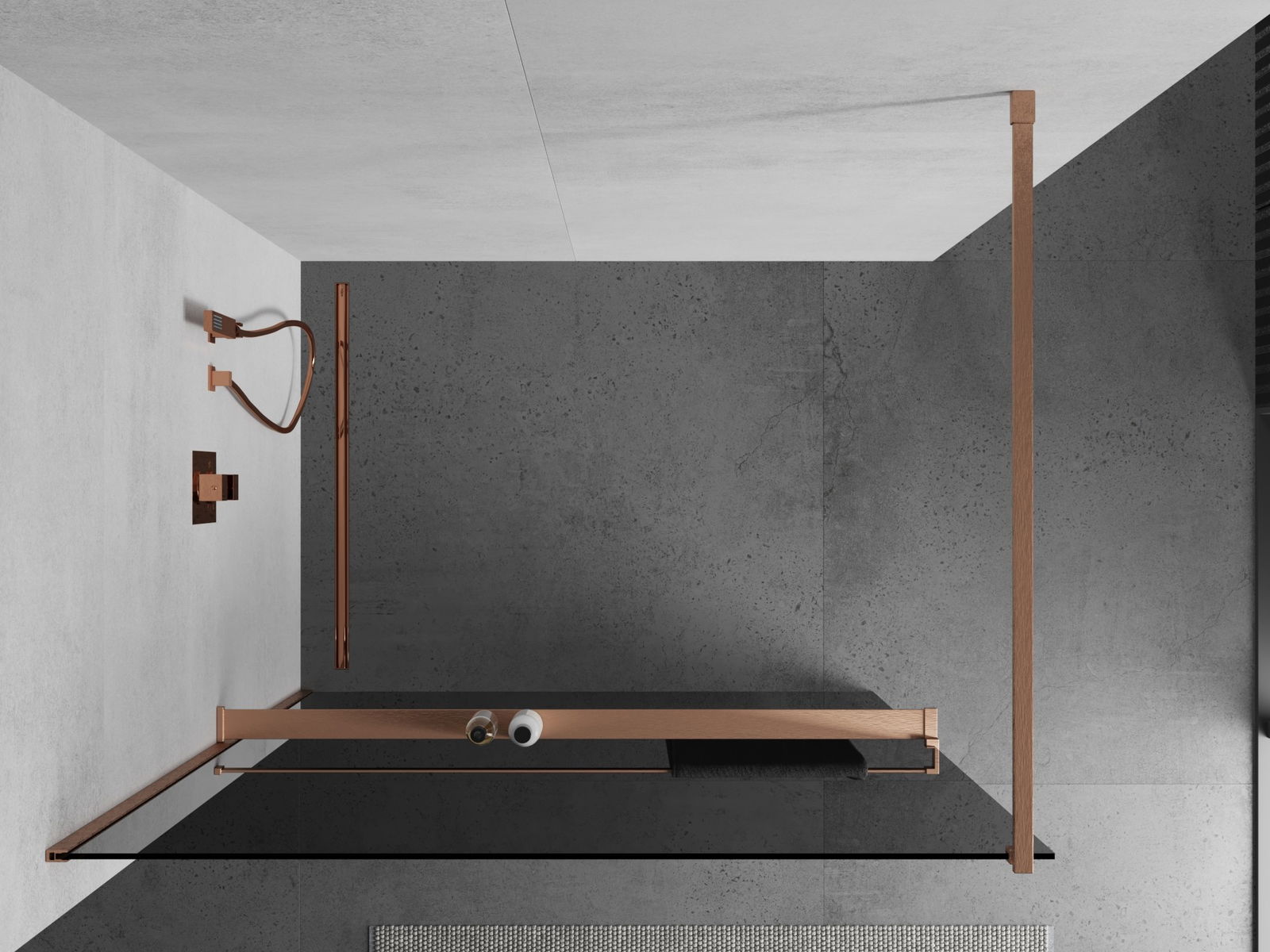 Mexen Kioto+ sprchová stěna s poličkou Walk-in 130 x 200 cm, grafit, kartáčovaná měď - 800-130-121-65-40