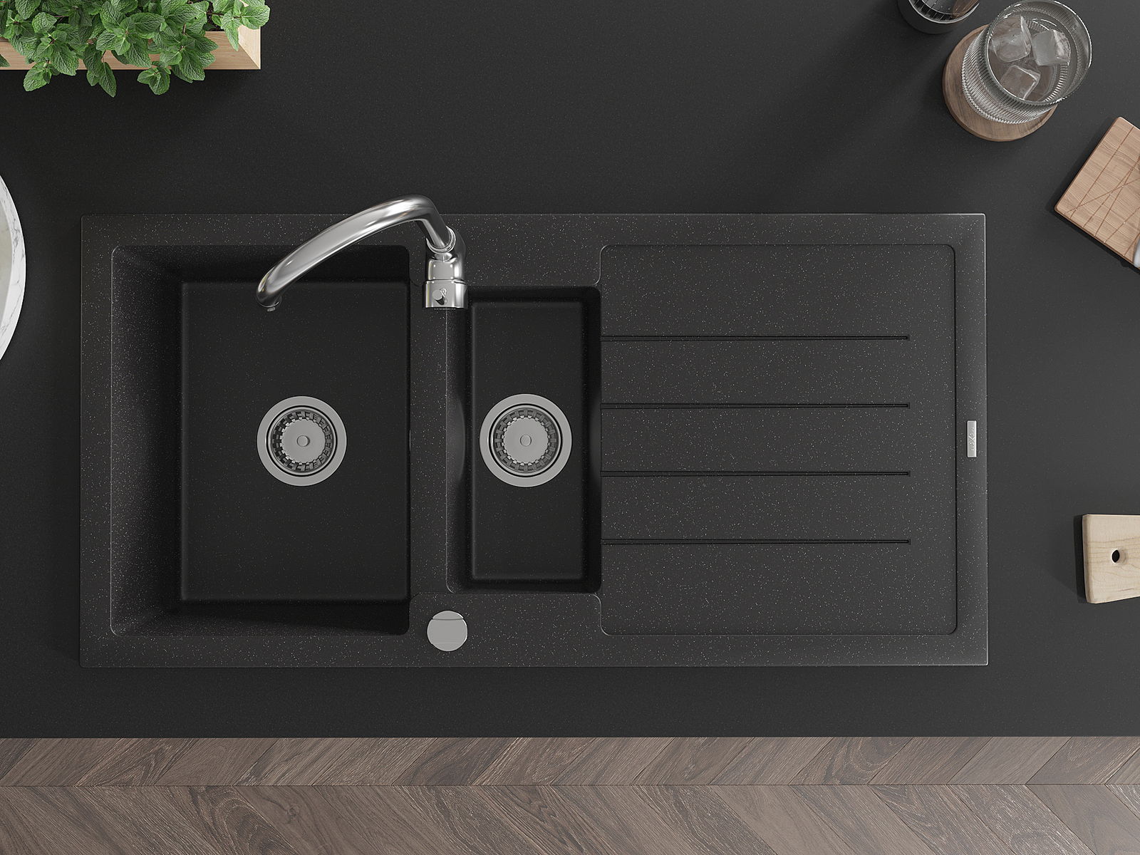 Mexen Andres granitový dřez 1,5-komorový s odkapávačem 1000 x 500 mm, černý/stříbrný metalik, sifon chrom - 6515101510-73