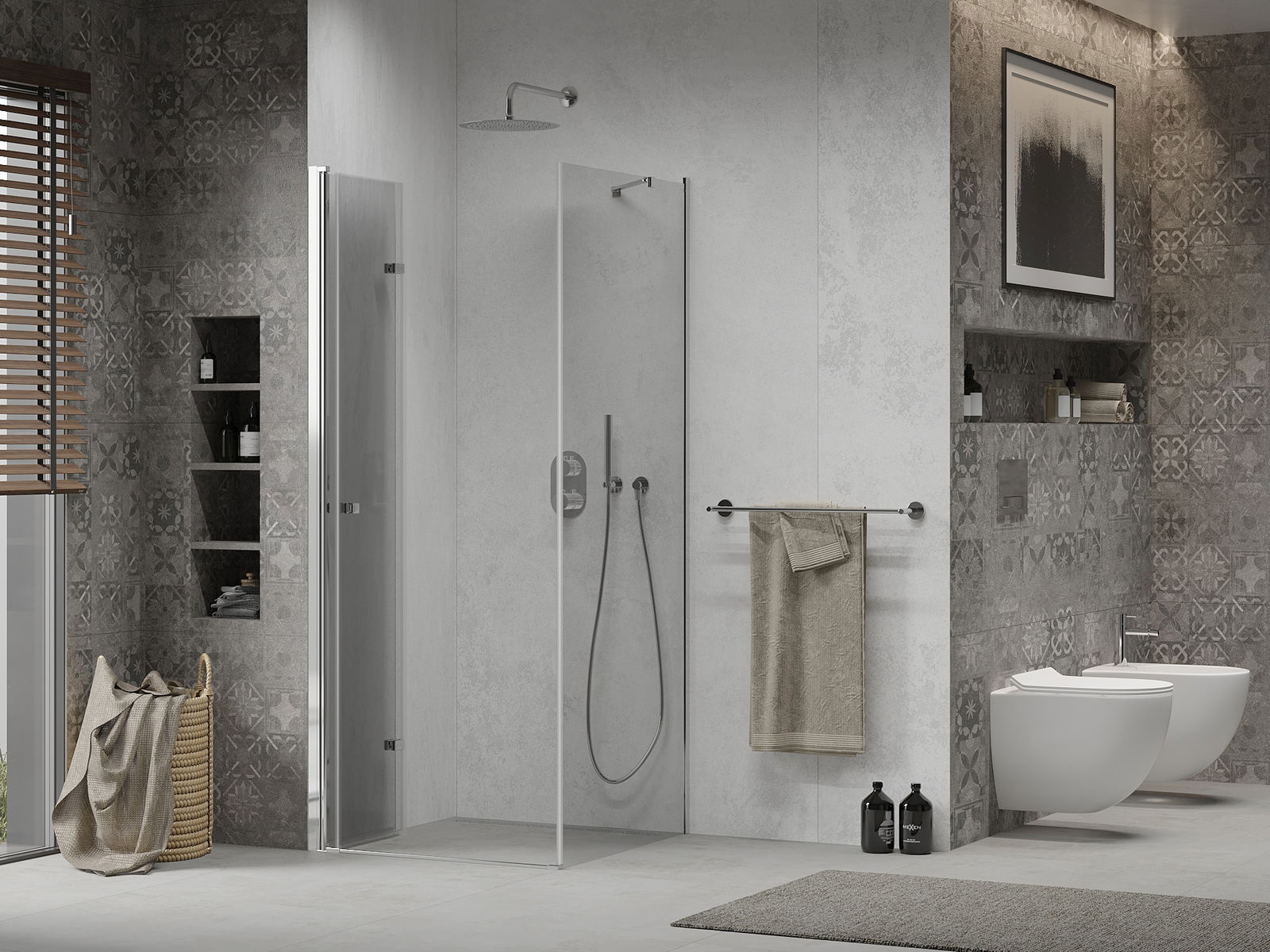 Možnost skládání dveří, jak dovnitř, tak ven, umožňuje získat více prostoru při nepoužívání sprchy. Je to ideální řešení pro menší koupelny, maximálně využívající dostupný prostor.