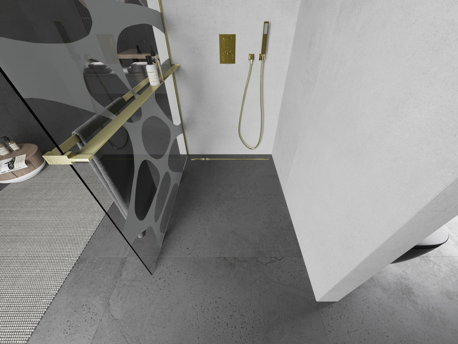 Mexen Kioto+ L Sprchová stěna s policí Walk-in 90 x 200 cm, bílá vlna, zlatá kartáčovaná - 800-090-123-55-97