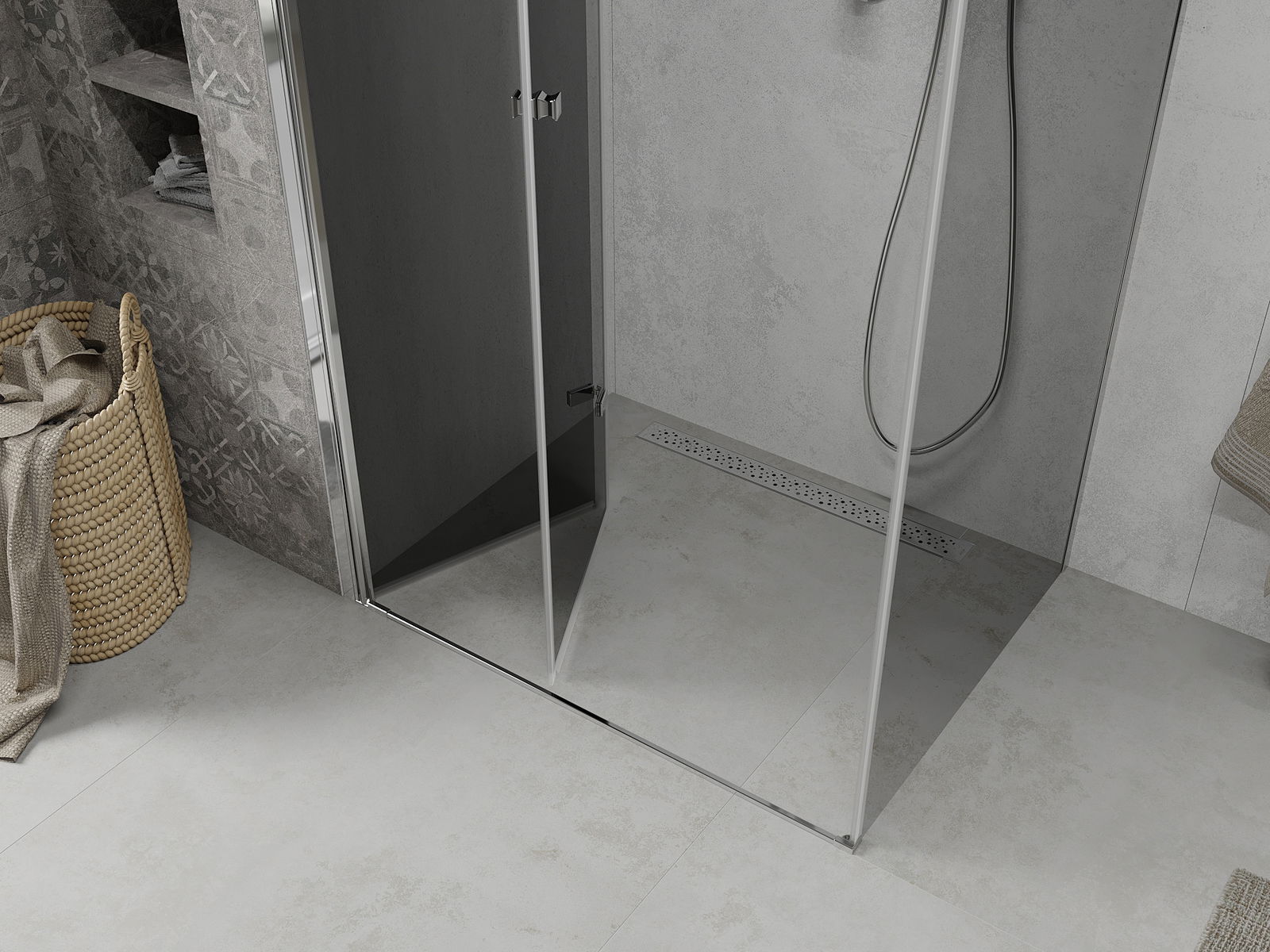 Možnost skládání dveří, jak dovnitř, tak ven, umožňuje získat více prostoru při nepoužívání sprchy. Je to ideální řešení pro menší koupelny, maximálně využívající dostupný prostor.