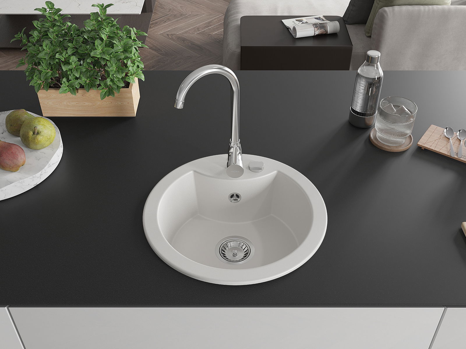 Dřez má předfrézovaný otvor o průměru 35 mm k samostatnému proražení. Může být použit například k montáži dávkovače na tekutinu, který eliminuje přítomnost plastových lahví v kuchyni a dodá jí elegantní finiš.