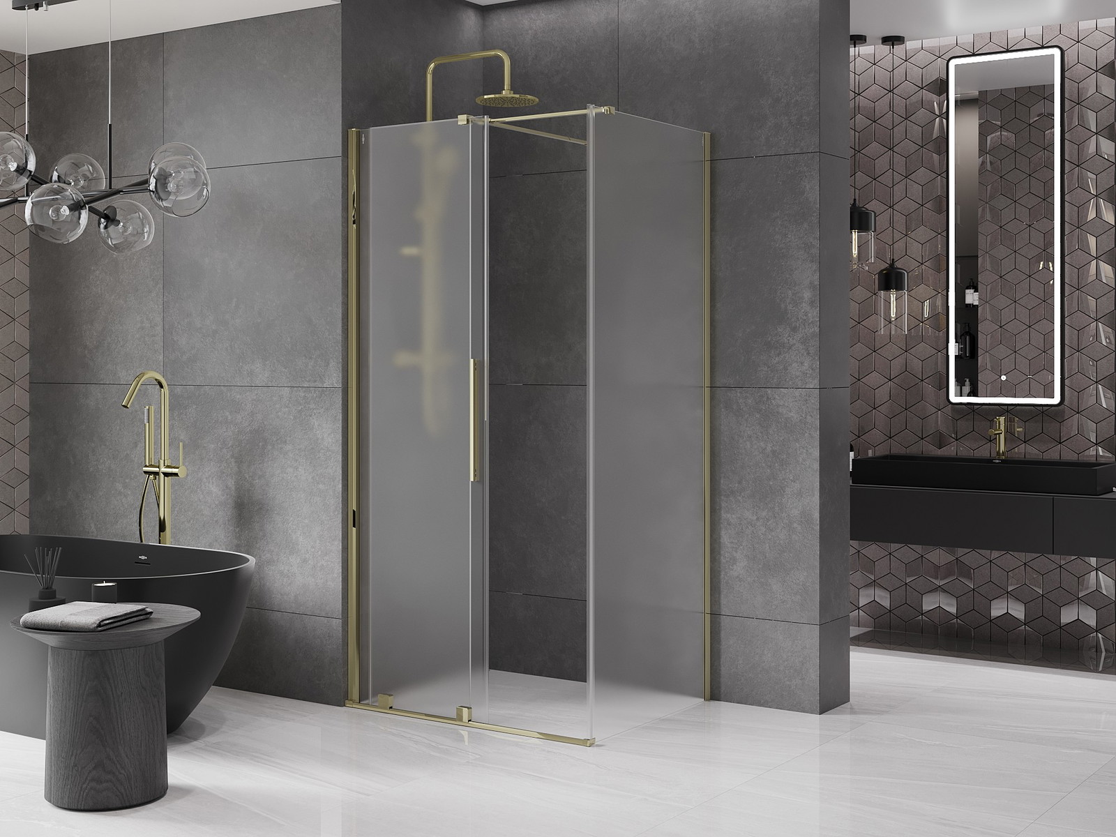 Mexen Velar je elegantní sprchová kabina o rozměrech 90x110 cm s matným sklem a zlatou povrchovou úpravou, která se skvěle hodí do každé koupelny. Vysoká 200 cm, nabízí univerzální montáž s možností přizpůsobení šířky a montáže na vaničku nebo dlažbu. Vyposażena je posuvnými dveřmi, hliníkovým profilem a ocelovým madlem, je mimořádně odolná. Tvrzené sklo o tloušťce 8 mm s vrstvou usnadňující čištění zajišťuje komfort užívání. V sadě těsnění a nejvyšší kvalita koleček.