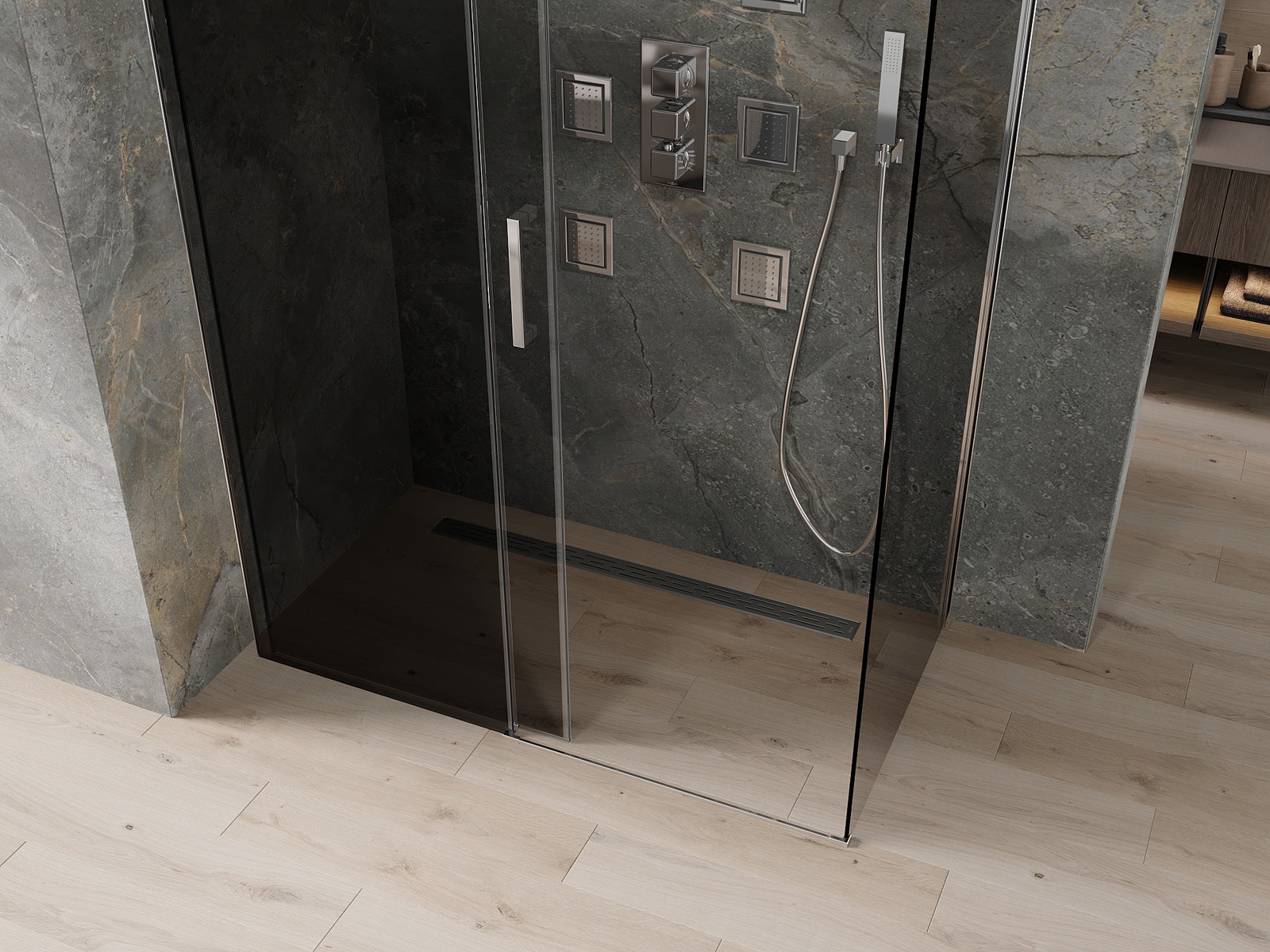 Praktická a pohodlná rukojeť je vyrobena z odolného a trvanlivého kovu. Moderní tvar ve spojení s povrchovou úpravou, která ladí s barvou profilů, dodává celku moderní a stylový vzhled, zdůrazňující estetiku každé koupelny.