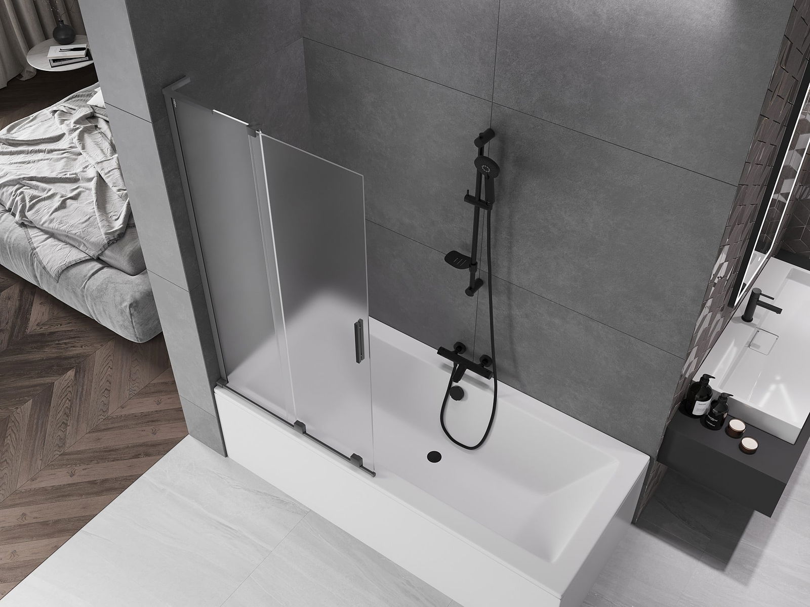 Mexen Velar L vanová zástěna 2-křídlá posuvná 90 x 150 cm, mráz, gun metal - 896-090-003-31-95