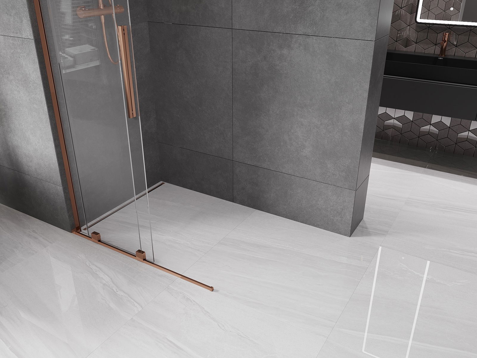 Mexen Velar L posuvná sprchová stěna Walk-in 110 x 200 cm, transparentní 8 mm, růžové zlato - 871-110-003-03-60