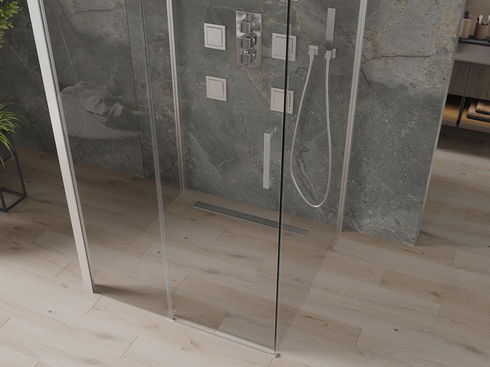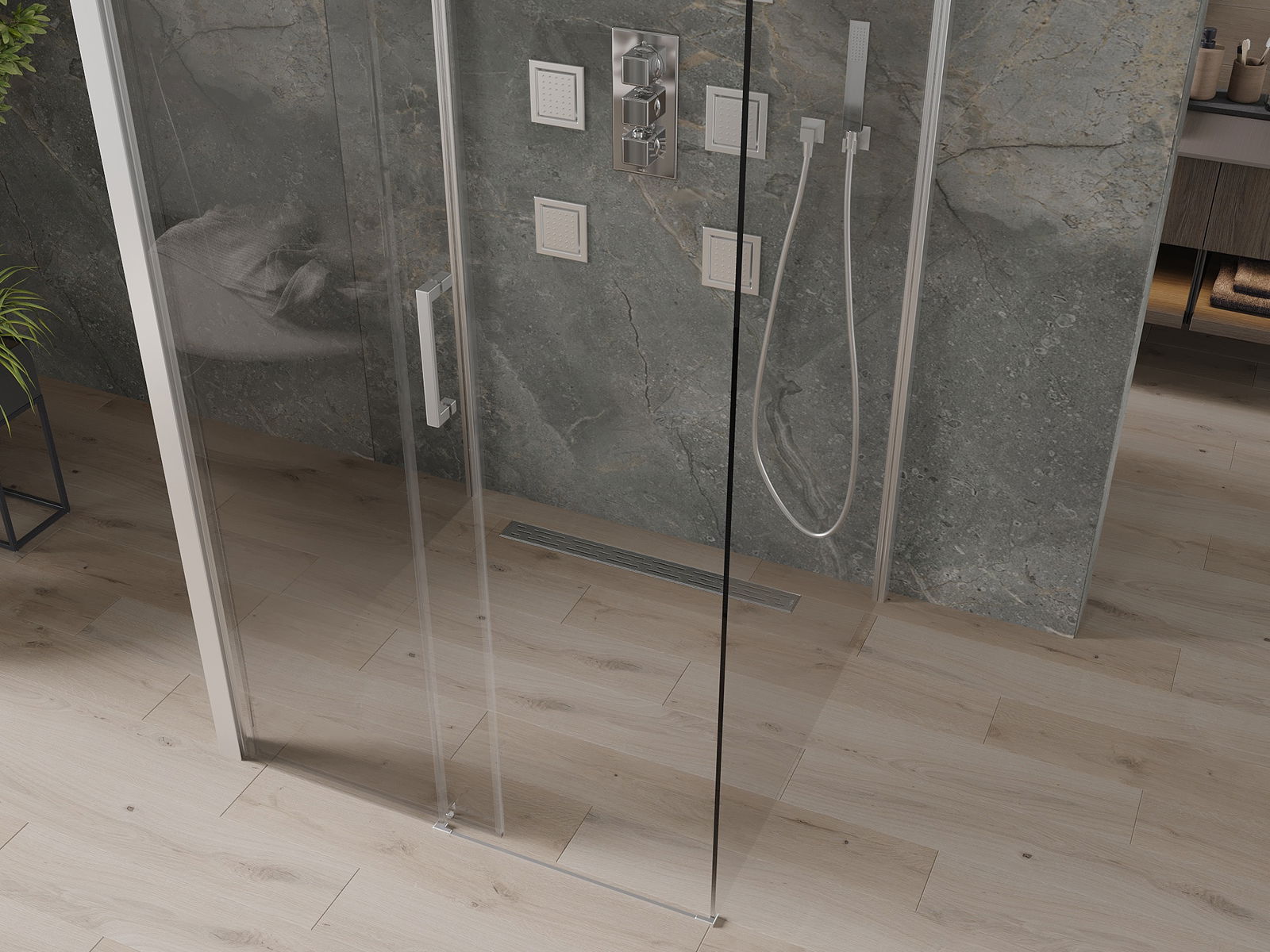 Produkt lze podle potřeby namontovat jak na sprchovou vaničku, tak přímo na podlahu. Univerzální způsob montáže umožňuje přizpůsobení produktu různým typům koupelen a konfiguracím prostor.