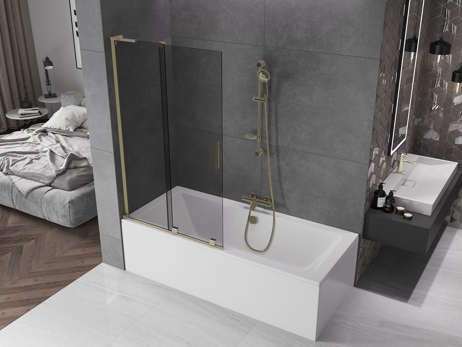 Mexen Velar L vanová zástěna 2-křídlová posuvná 100 x 150 cm, grafit, zlatá - 896-100-003-41-50