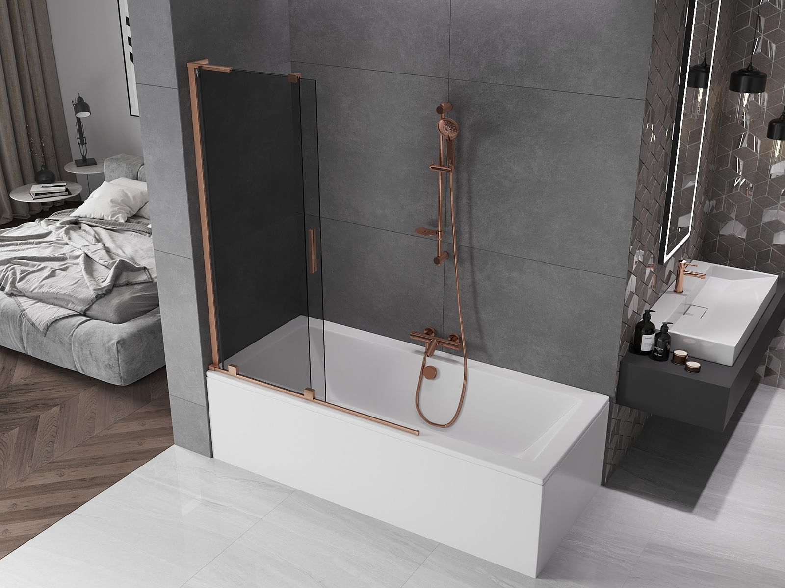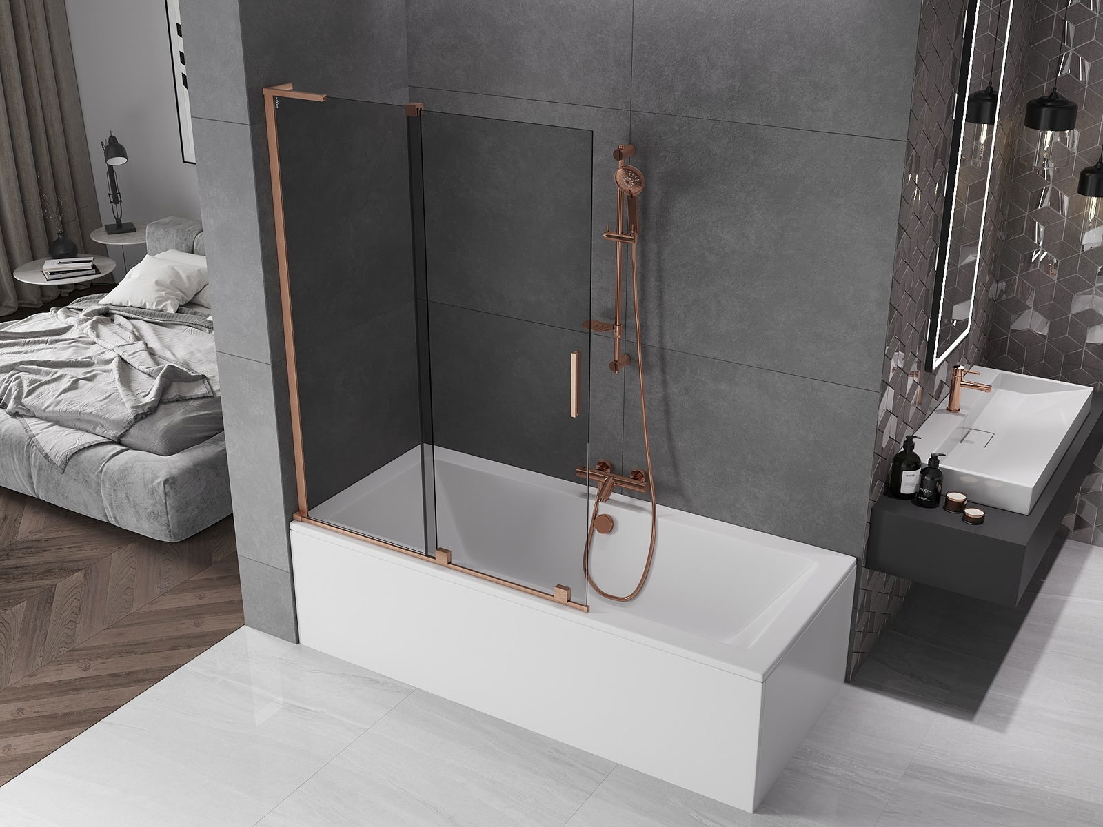 Mexen Velar L vanová zástěna 2-křídlová posuvná 120 x 150 cm, grafit, kartáčovaná měď - 896-120-003-41-65