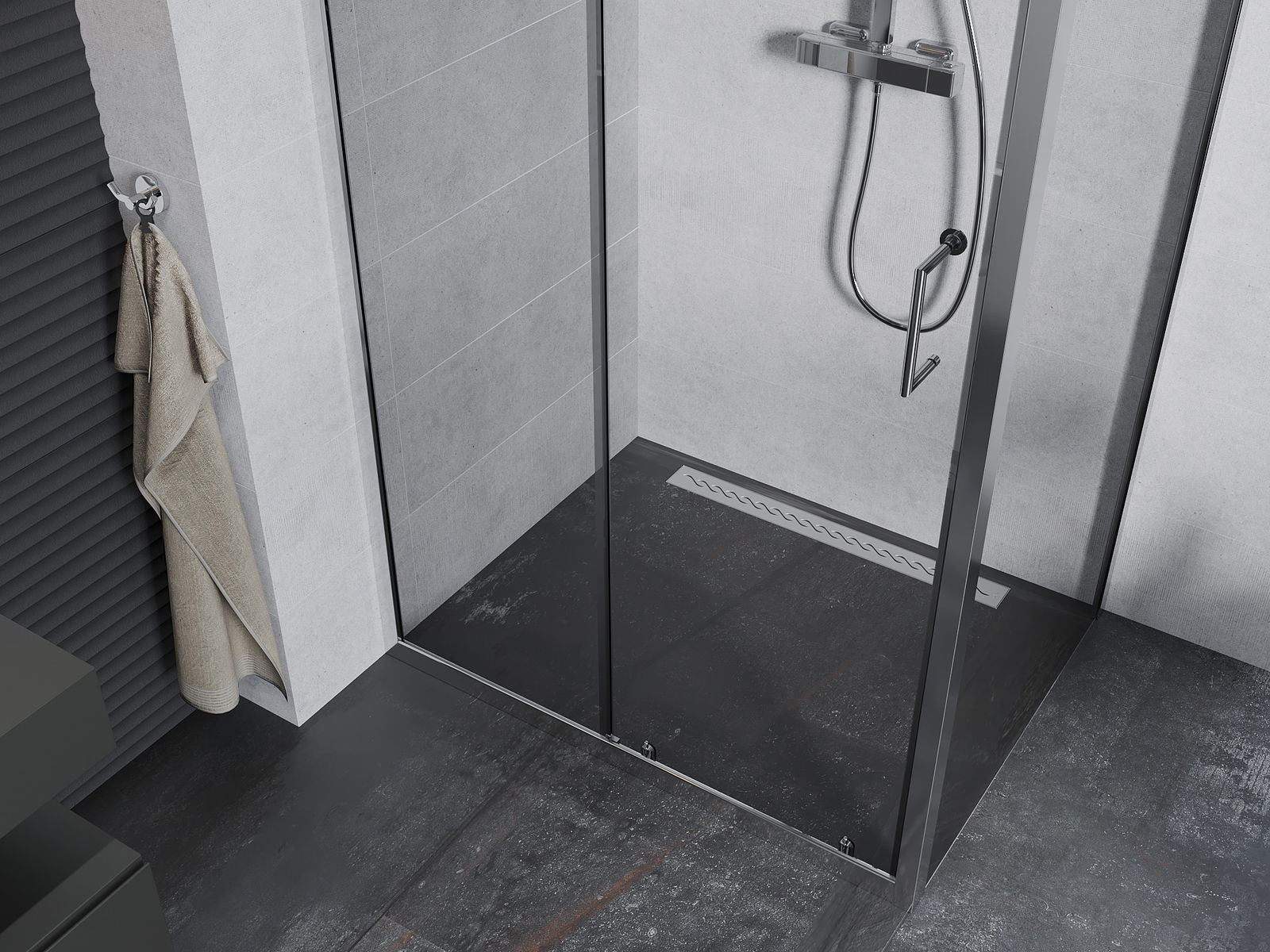 Praktická a pohodlná rukojeť je vyrobena z odolného a trvanlivého kovu. Moderní tvar ve spojení s povrchovou úpravou, která ladí s barvou profilů, dodává celku moderní a stylový vzhled, zdůrazňující estetiku každé koupelny.