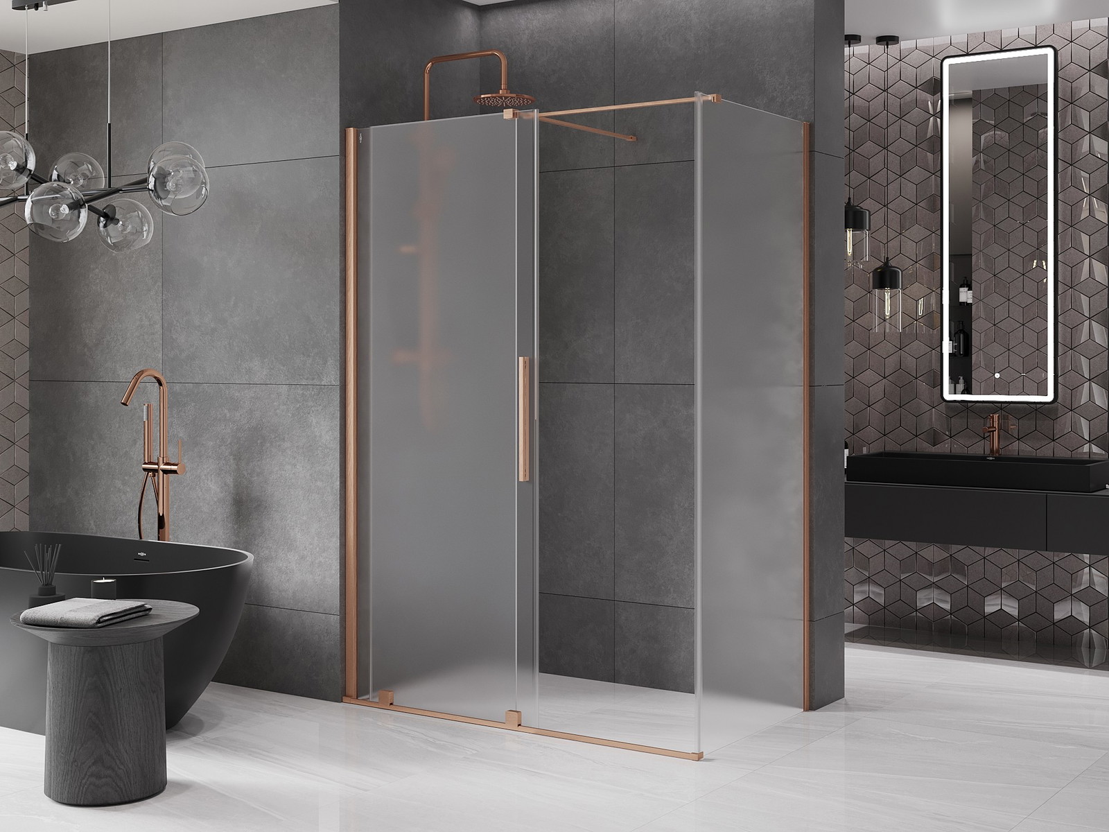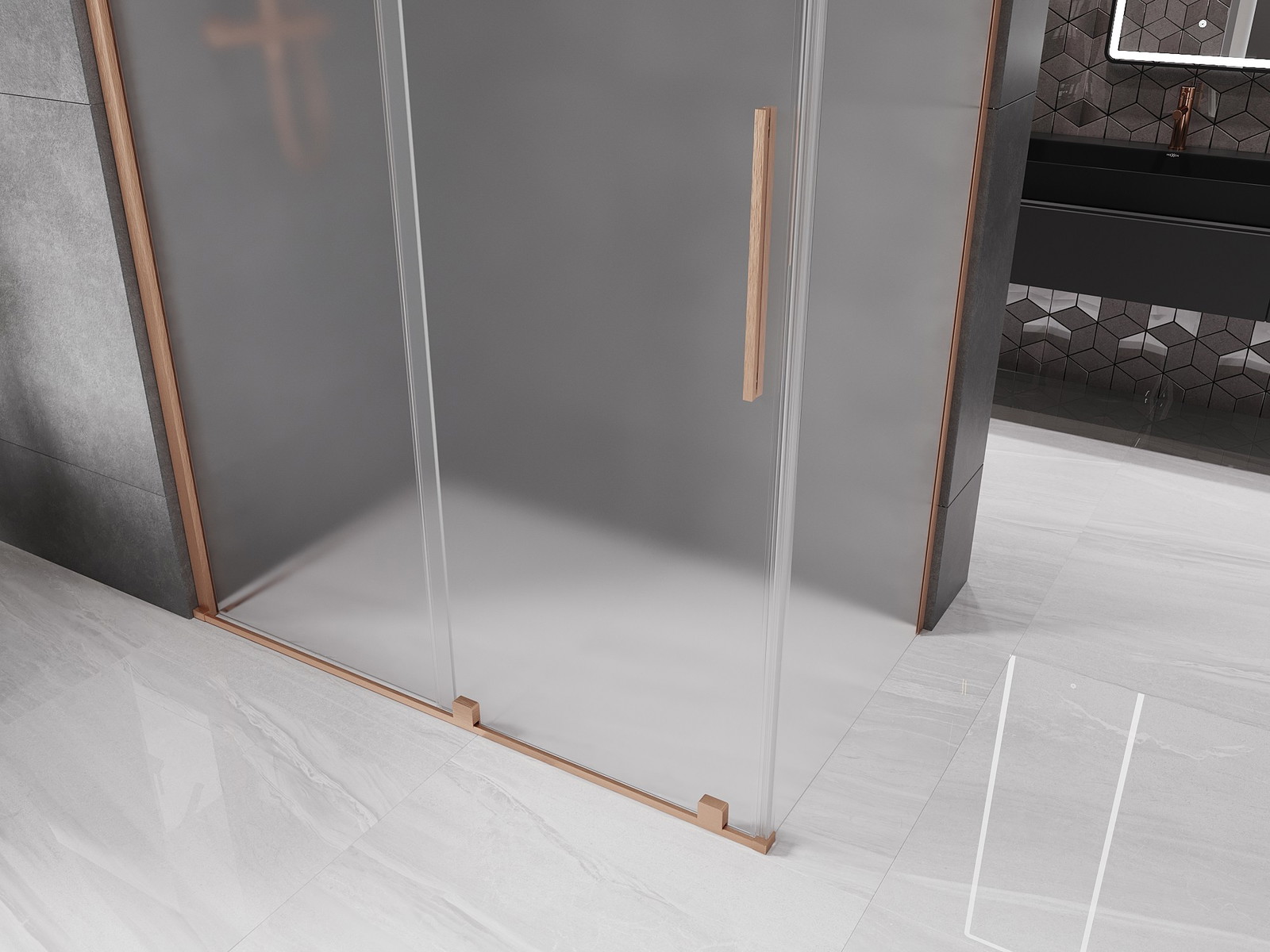 Sprchová kabina Mexen Velar je elegantní a funkční řešení pro každou koupelnu. Její univerzální montáž, možnost regulace šířky a vyrovnání nerovností stěny zajišťují snadnou adaptaci do různých prostor. Rozměry 140x75 cm a výška 200 cm zaručují komfort používání. Posuvné dveře z tvrzeného skla o tloušťce 8 mm v matné barvě dodávají kabině eleganci, zatímco kartáčovaná měď na povrchové úpravě dodává nadčasový styl. Dále hliníkový profil, rukojeť z nerezové oceli a vrstva usnadňující čištění z ní činí vynikající volbu pro každou moderní koupelnu.