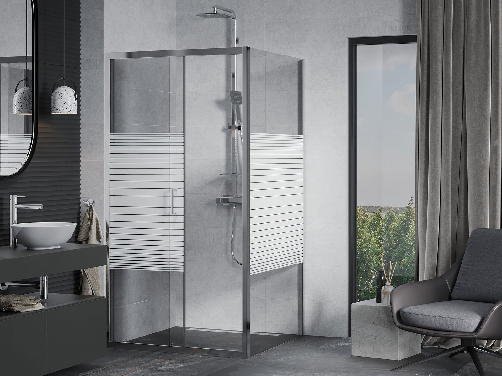 Praktická a pohodlná rukojeť je vyrobena z odolného a trvanlivého kovu. Moderní tvar ve spojení s povrchovou úpravou, která ladí s barvou profilů, dodává celku moderní a stylový vzhled, zdůrazňující estetiku každé koupelny.