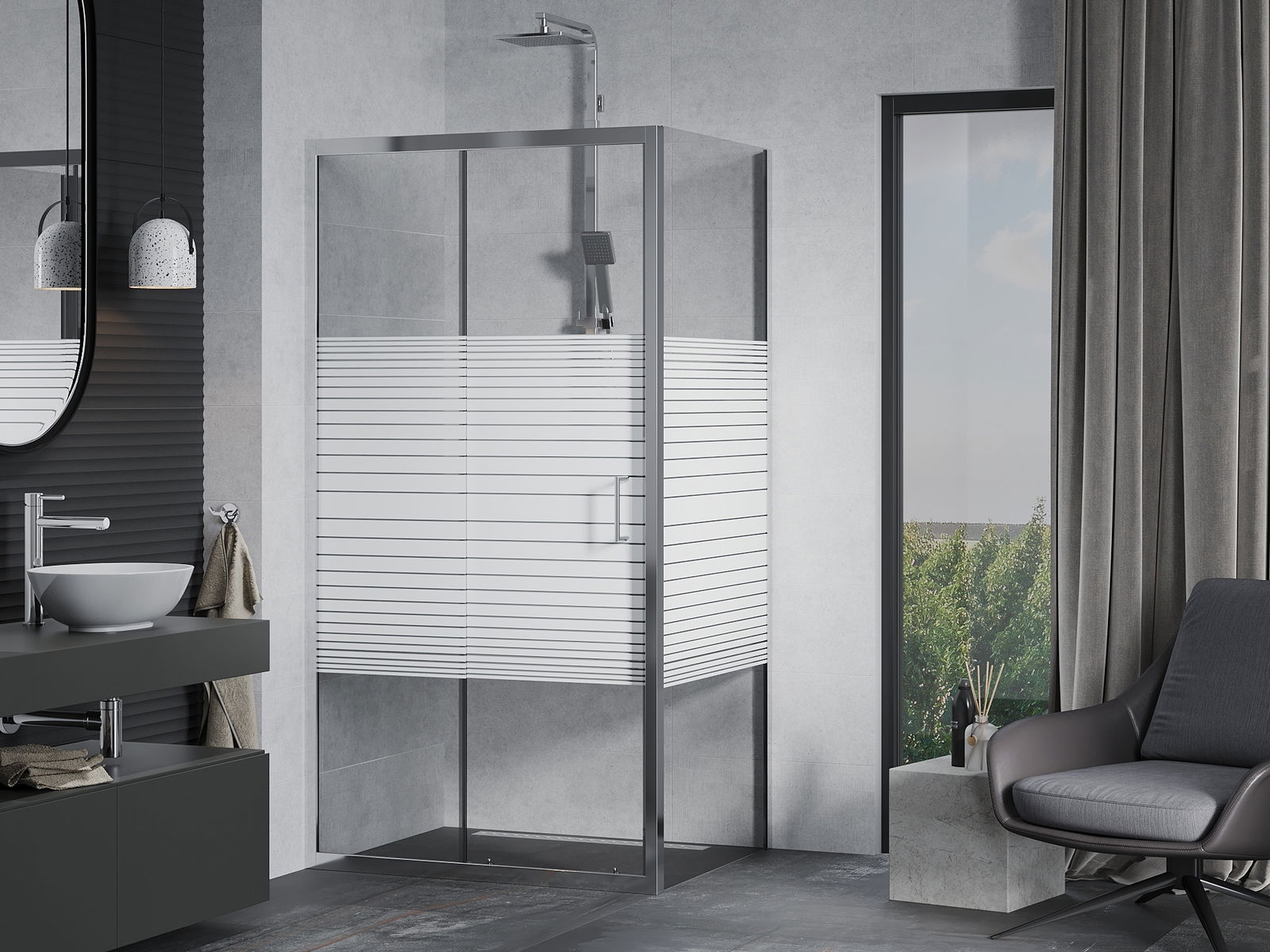 Praktická a pohodlná rukojeť je vyrobena z odolného a trvanlivého kovu. Moderní tvar ve spojení s povrchovou úpravou, která ladí s barvou profilů, dodává celku moderní a stylový vzhled, zdůrazňující estetiku každé koupelny.