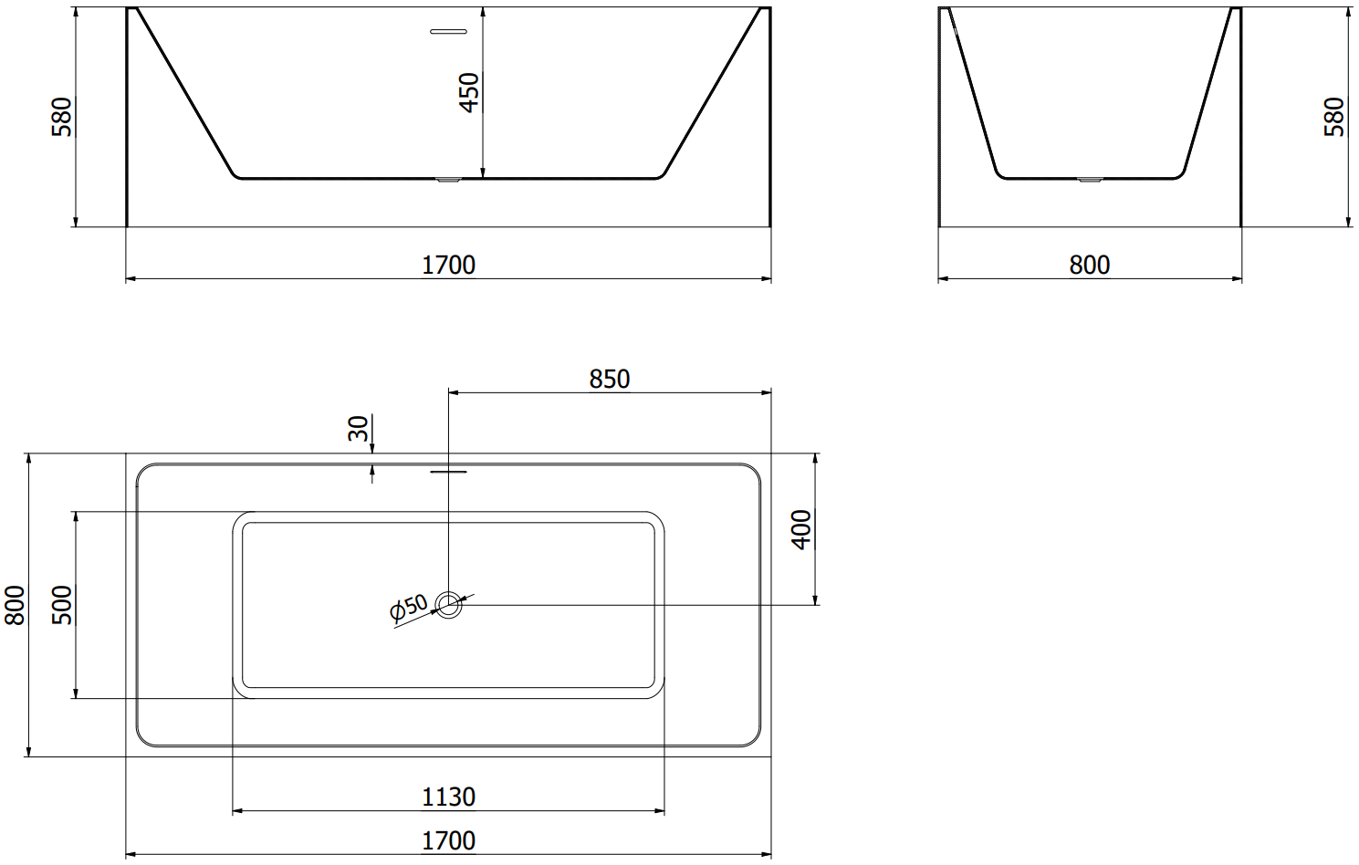 Mexen Nita volně stojící vana 170 x 80 cm, bílá, přepad gun metal - 52091708000-95