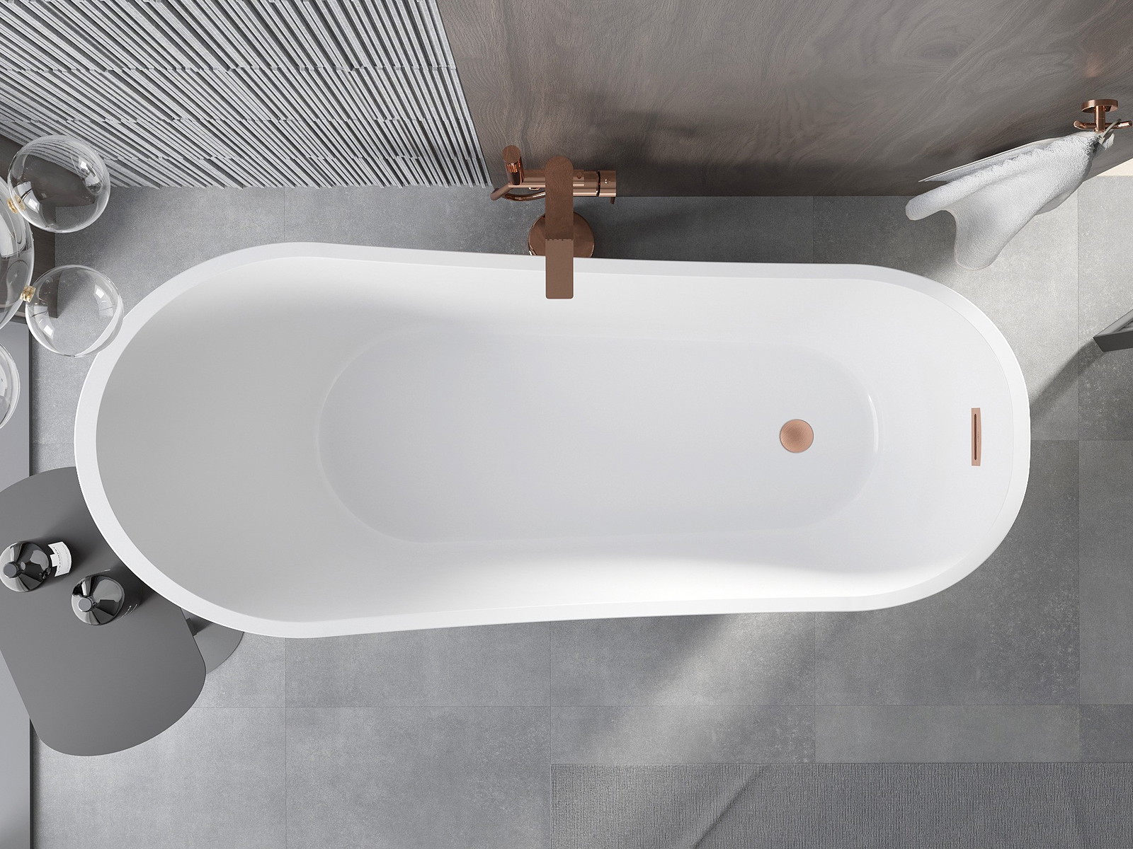 Volně stojící vana Mexen Alta 170 x 75 cm je ideální kombinací stylu a funkčnosti. Vyrobena ze sanitárního akrylu, vyznačuje se elegantním bílo-černým barevným provedením a povrchovou úpravou z kartáčované mědi. Oválný tvar a vysoká odolnost proti matování a UV záření zajišťují trvanlivost na dlouhá léta. Montáž je snadná díky volně stojící konstrukci. Vana je vybavena přepadovým otvorem a sifonem, což zvyšuje komfort použití. Skvěle se hodí do každé moderní koupelny.