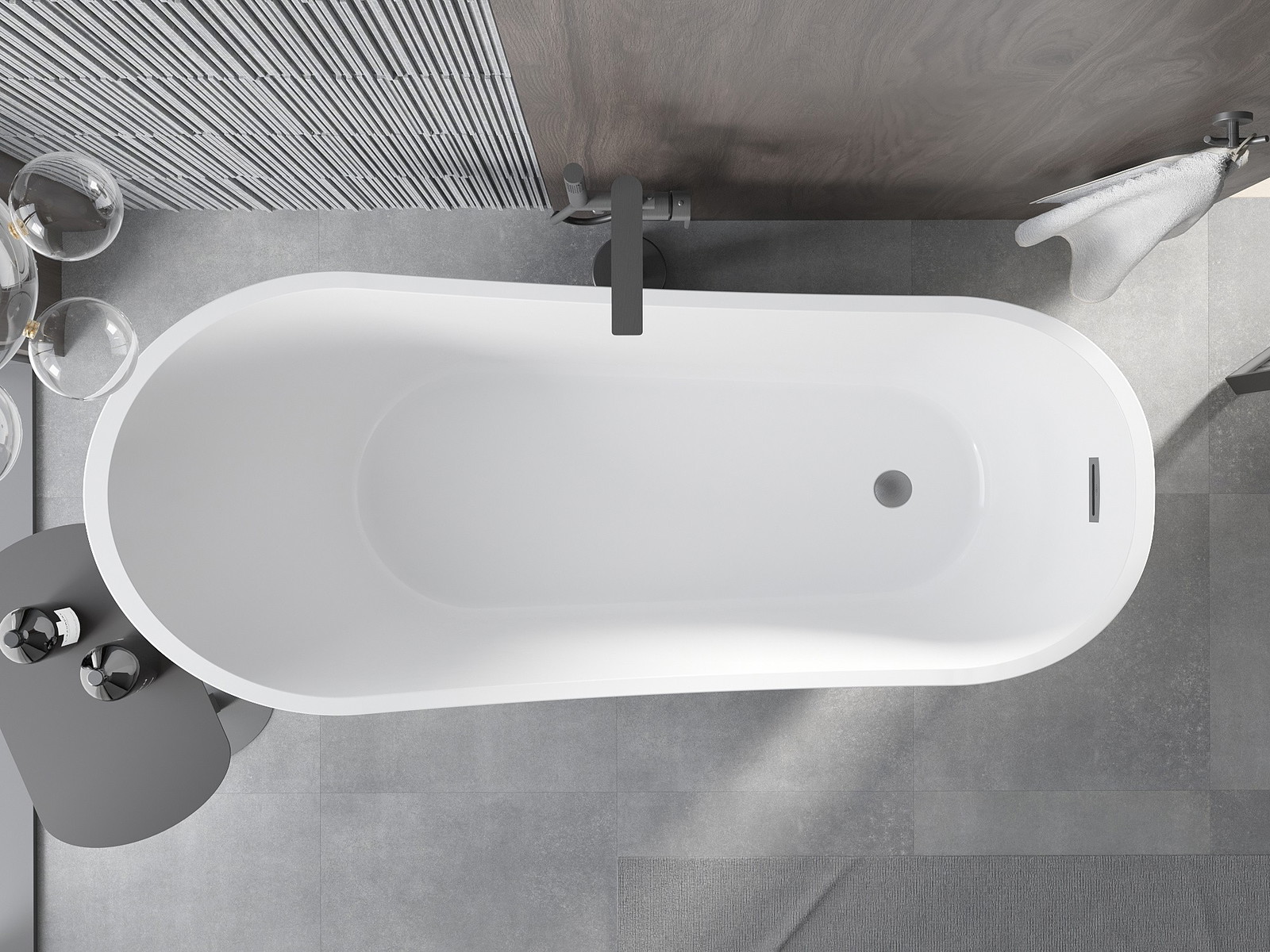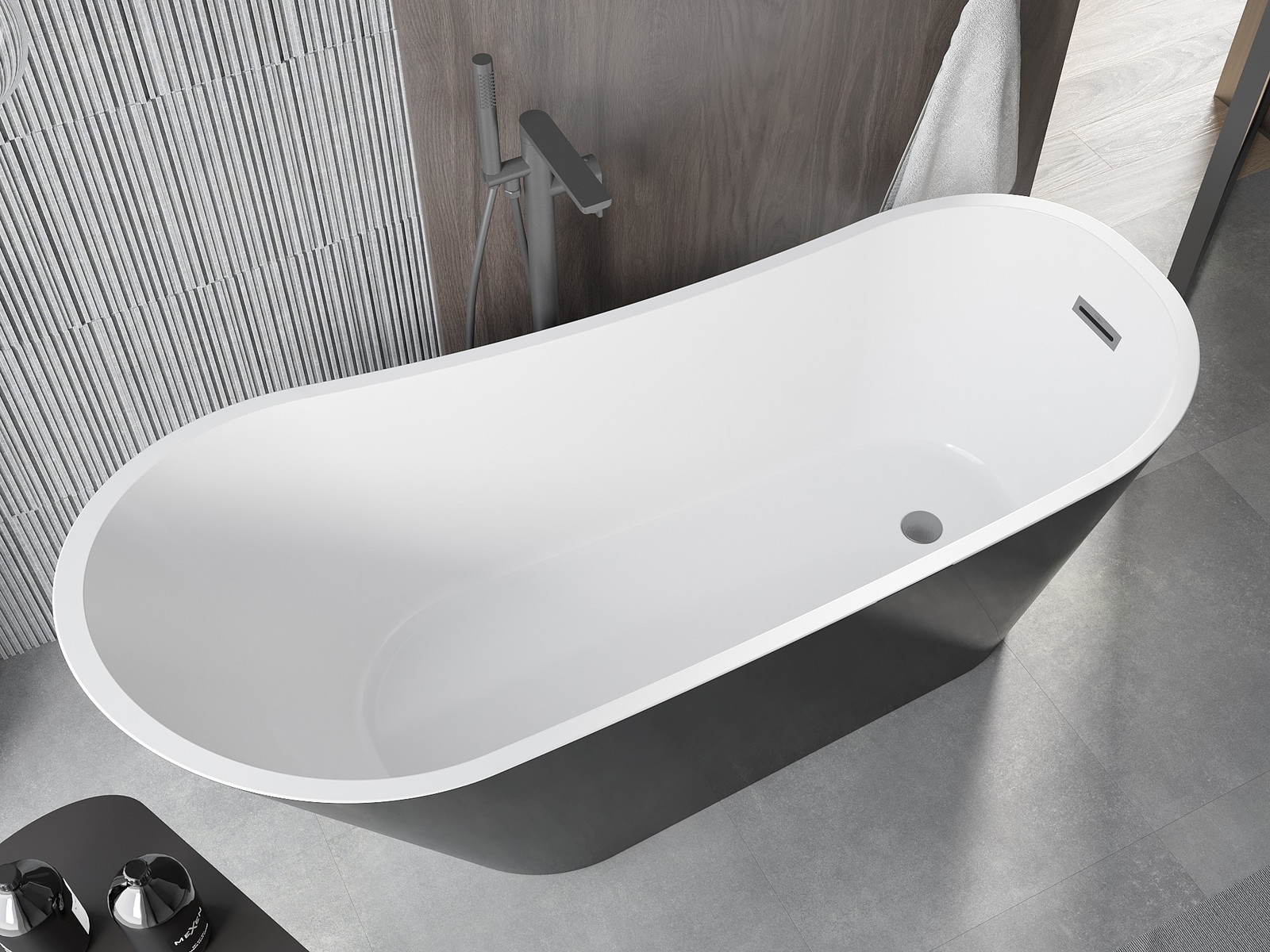 Mexen Alta je elegantní volně stojící vana o rozměrech 170 x 75 cm, která kombinuje modernost a funkčnost. Vyrobená ze sanitárního akrylu, zajišťuje trvanlivost a odolnost proti matování a UV záření. Oválný tvar a jedinečná povrchová úprava v bílo-černé barvě a kartáčovaném gun gray ji odlišují od ostatních produktů. Vana je snadná k montáži a v sadě je přiložen sifon a zátka klik klak, což z ní činí kompletní řešení pro každou koupelnu.