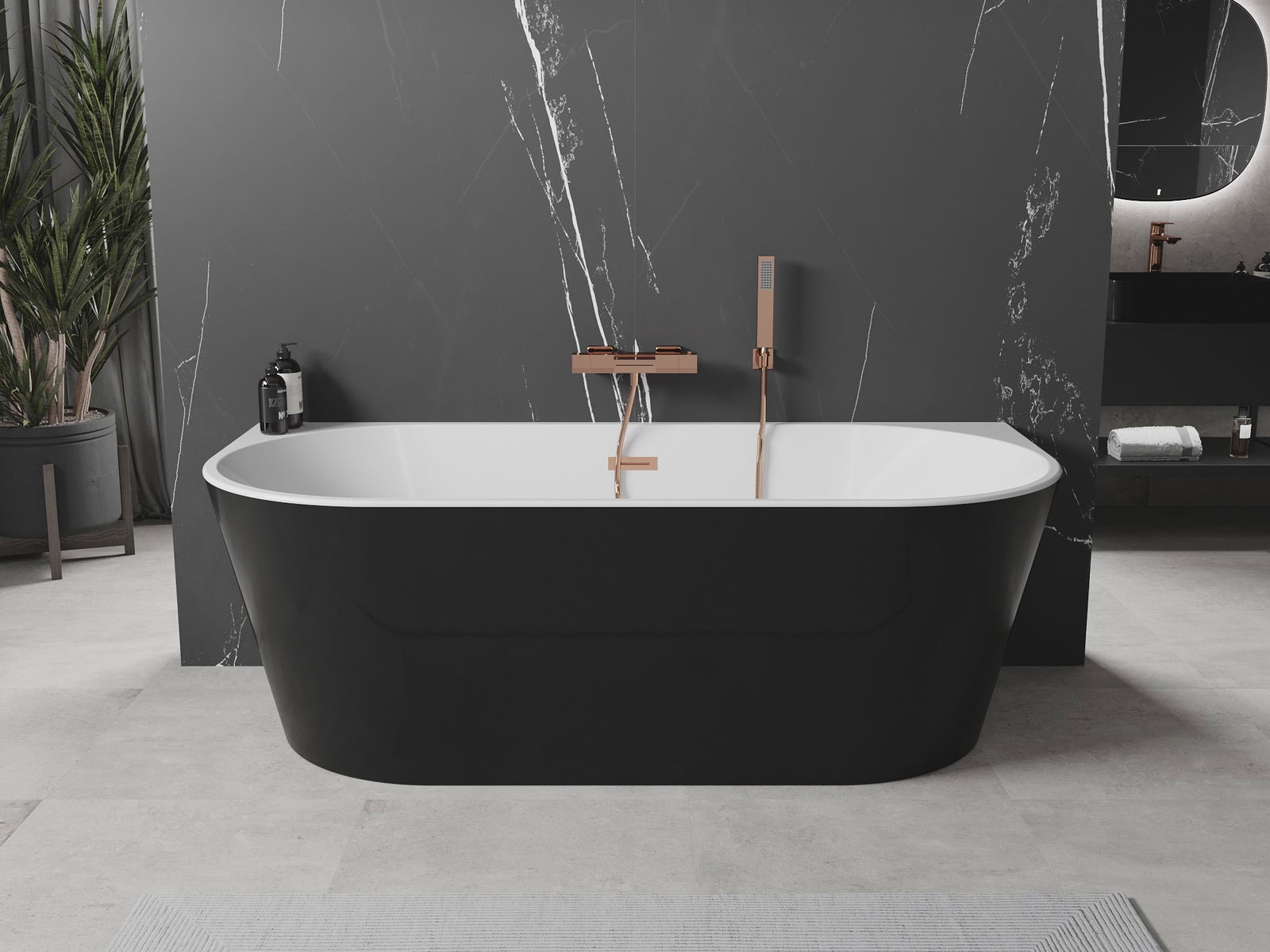 Oválná volně stojící vana o rozměrech 160 x 80 cm, která se dokonale hodí do moderních koupelen. Vyrobena ze sanitárního akrylu, vyznačuje se vysokou odolností vůči matování a UV záření. Bílá a černá barevnost v kombinaci s růžovým zlatem v povrchové úpravě dodává eleganci. Vana je navržena s přepadovým otvorem a sifonem v balení, což z ní činí funkční volbu. Díky středovému odtoku a montáži ke stěně se ideálně hodí do každého prostoru.