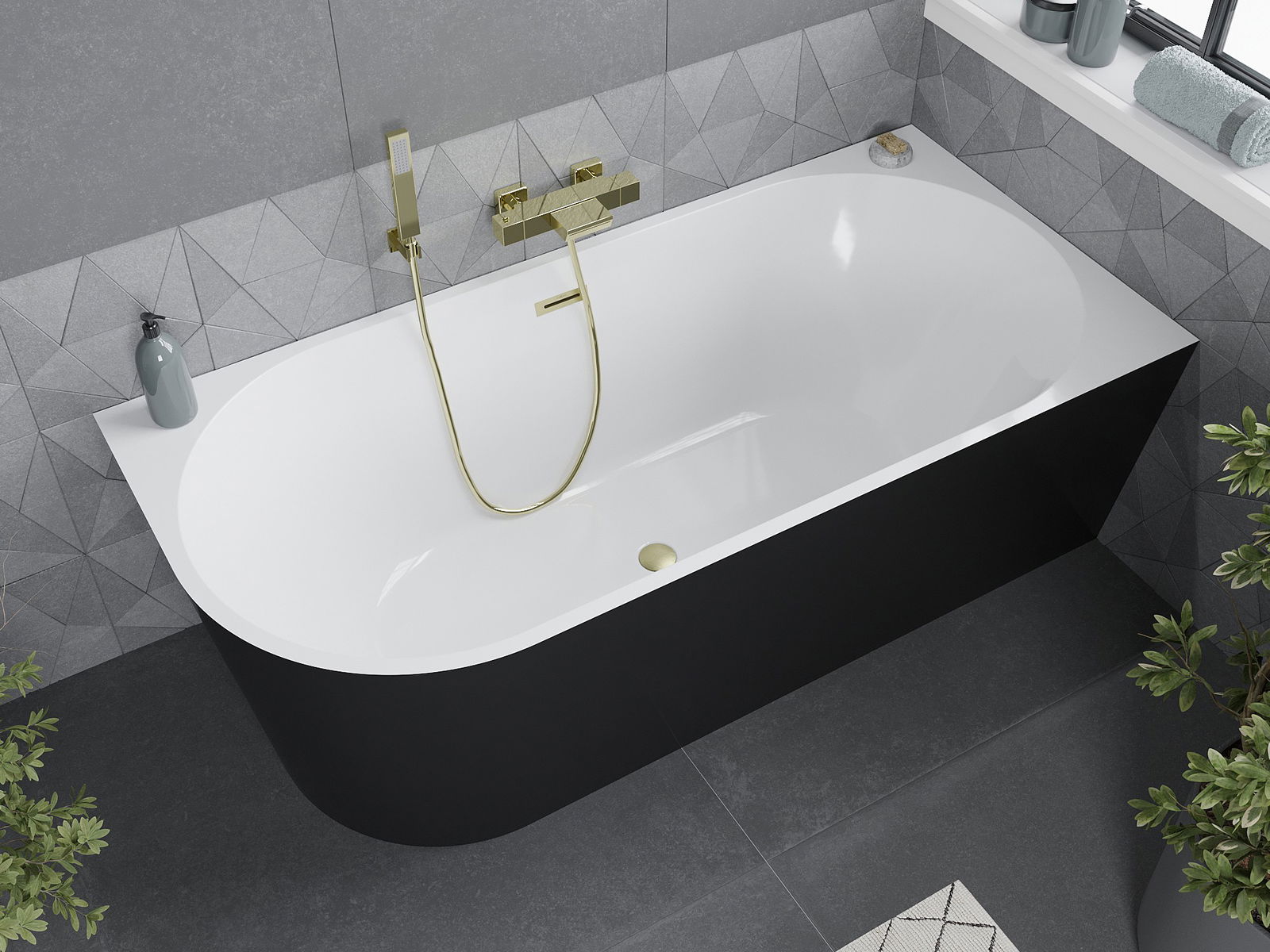 Mexen Mia volně stojící rohová vana pravá 180 x 80 cm, bílá/černá, přepad zlatý kartáčovaný - 52691808075P-55