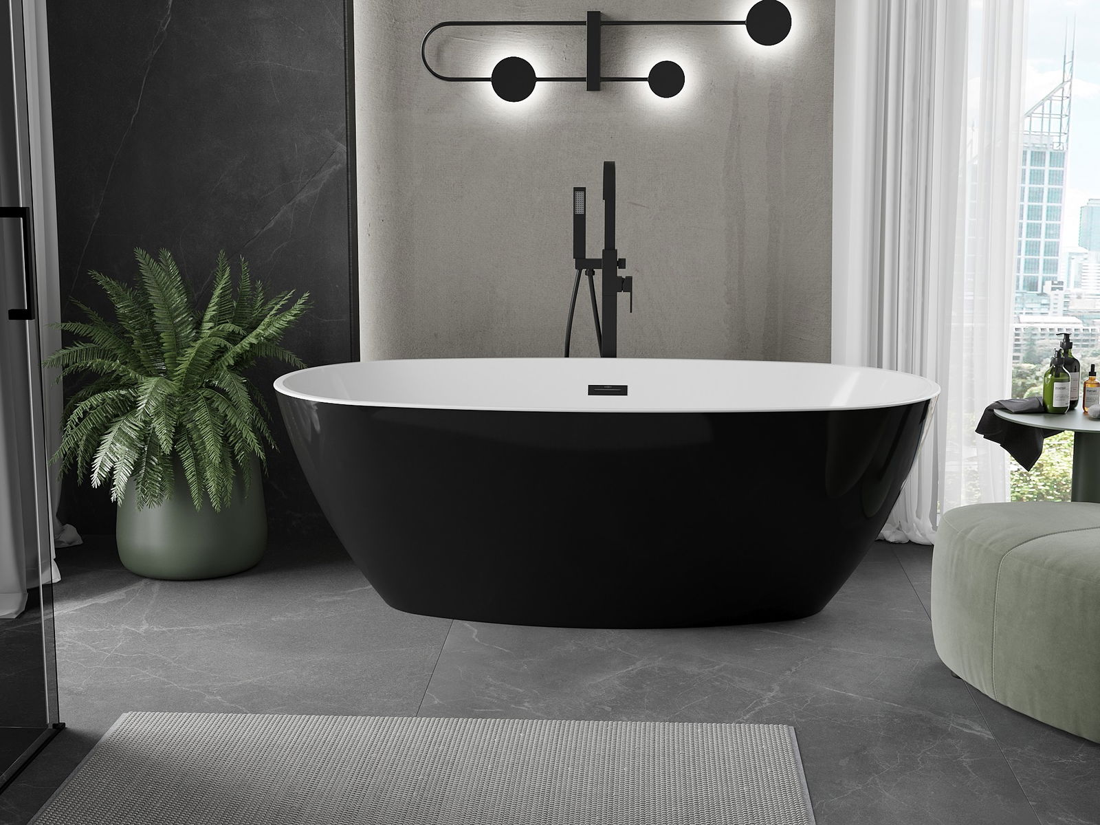 Volně stojící vana 180 x 80 cm v elegantní kombinaci bílé a černé akrylové barvy je stylovým prvkem každé koupelny. Její oválný tvar a lesklý povrch podtrhují moderní charakter. Disponuje přepadovým otvorem a sifon je součástí balení, což zajišťuje komfort při každodenním používání. Odolná vůči matování a UV záření, bude potěšením pro oči po mnoho let. Navíc, montáž je snadná díky volně stojící konstrukci.