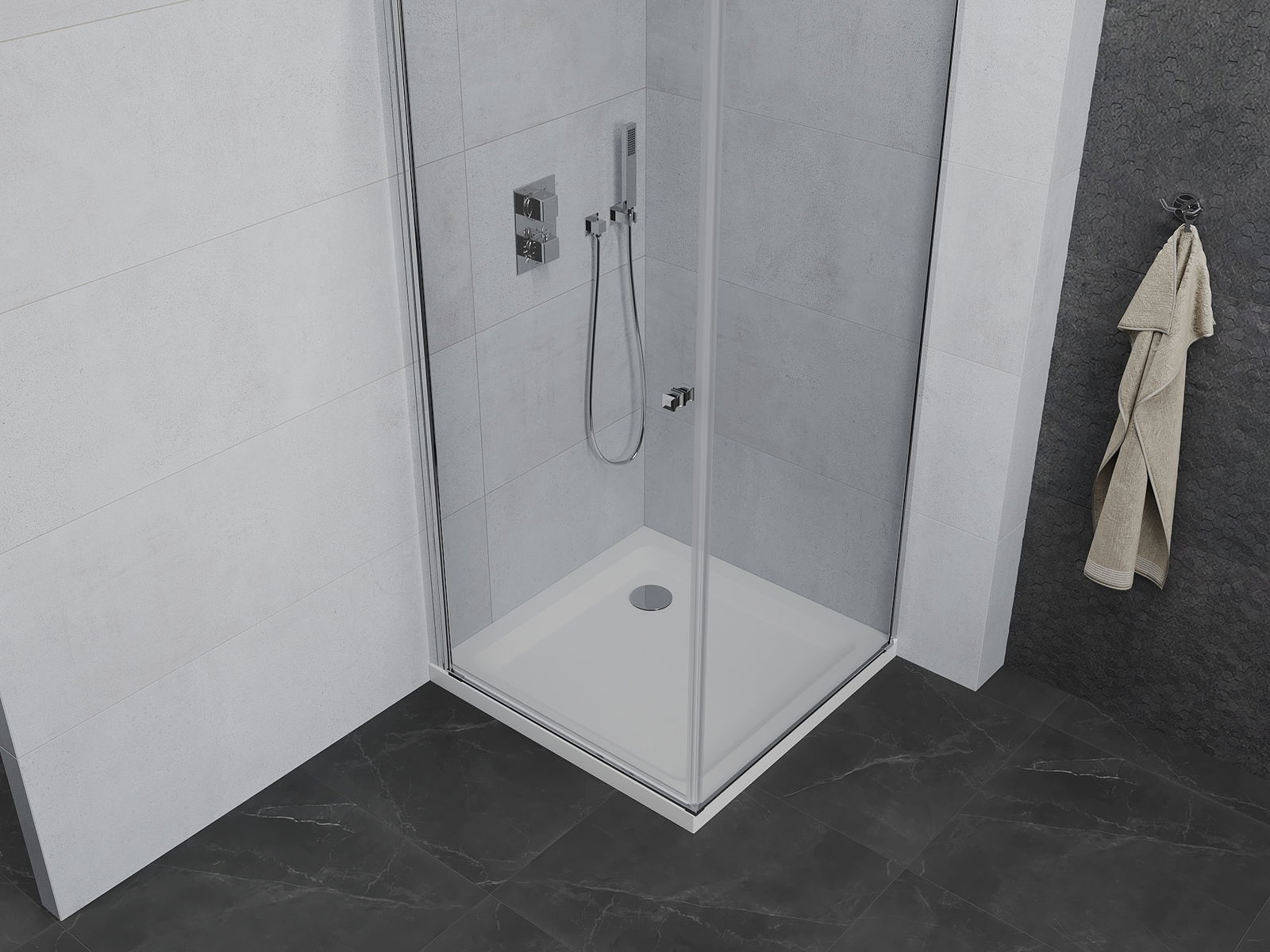 Praktická a pohodlná rukojeť je vyrobena z odolného a trvanlivého kovu. Moderní tvar ve spojení s povrchovou úpravou, která ladí s barvou profilů, dodává celku moderní a stylový vzhled, zdůrazňující estetiku každé koupelny.